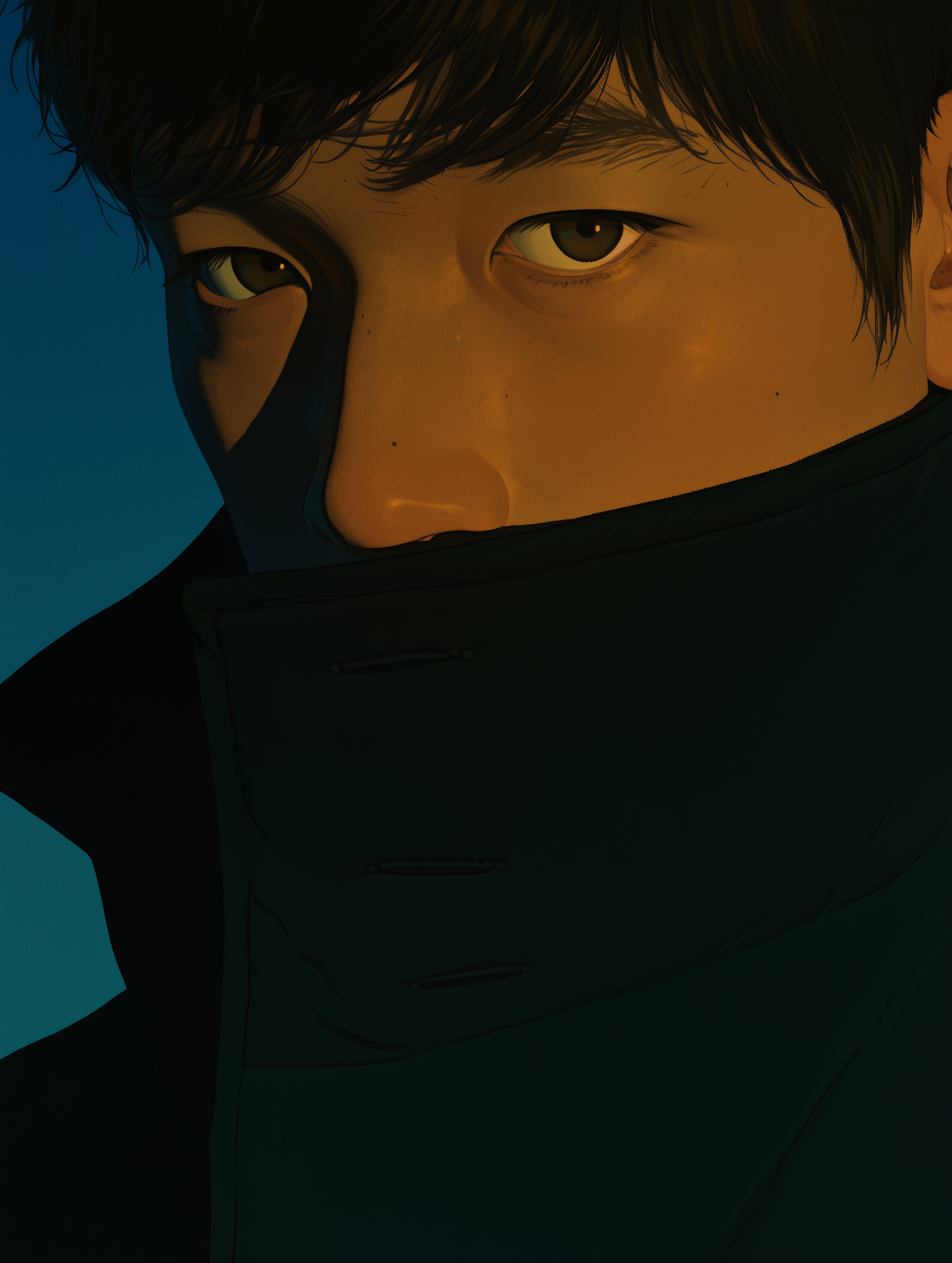 Close-up illustration of an Asian male with intense gaze, wearing a high-collared coat against a moody blue background.