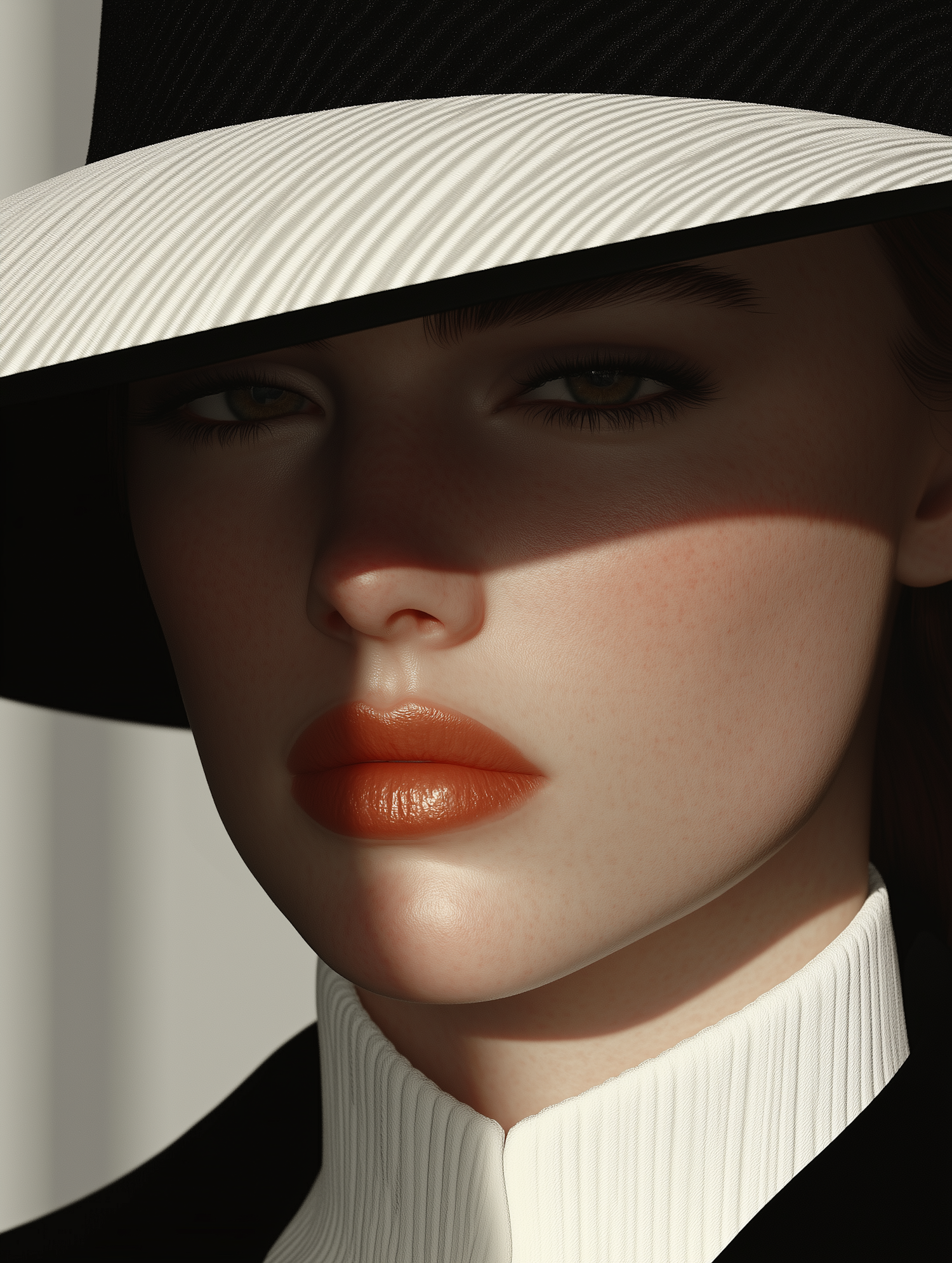 Close-up of a woman in a wide-brimmed hat, with bold red lips and a high-collared shirt, casting a dramatic shadow over her face.