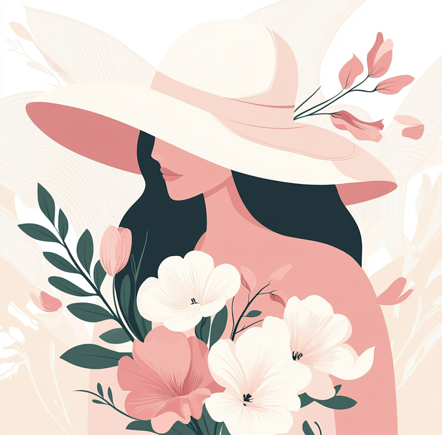 Elegant illustration of a woman in a wide-brimmed hat holding a bouquet of pink and white flowers, with a soft pastel color palette.