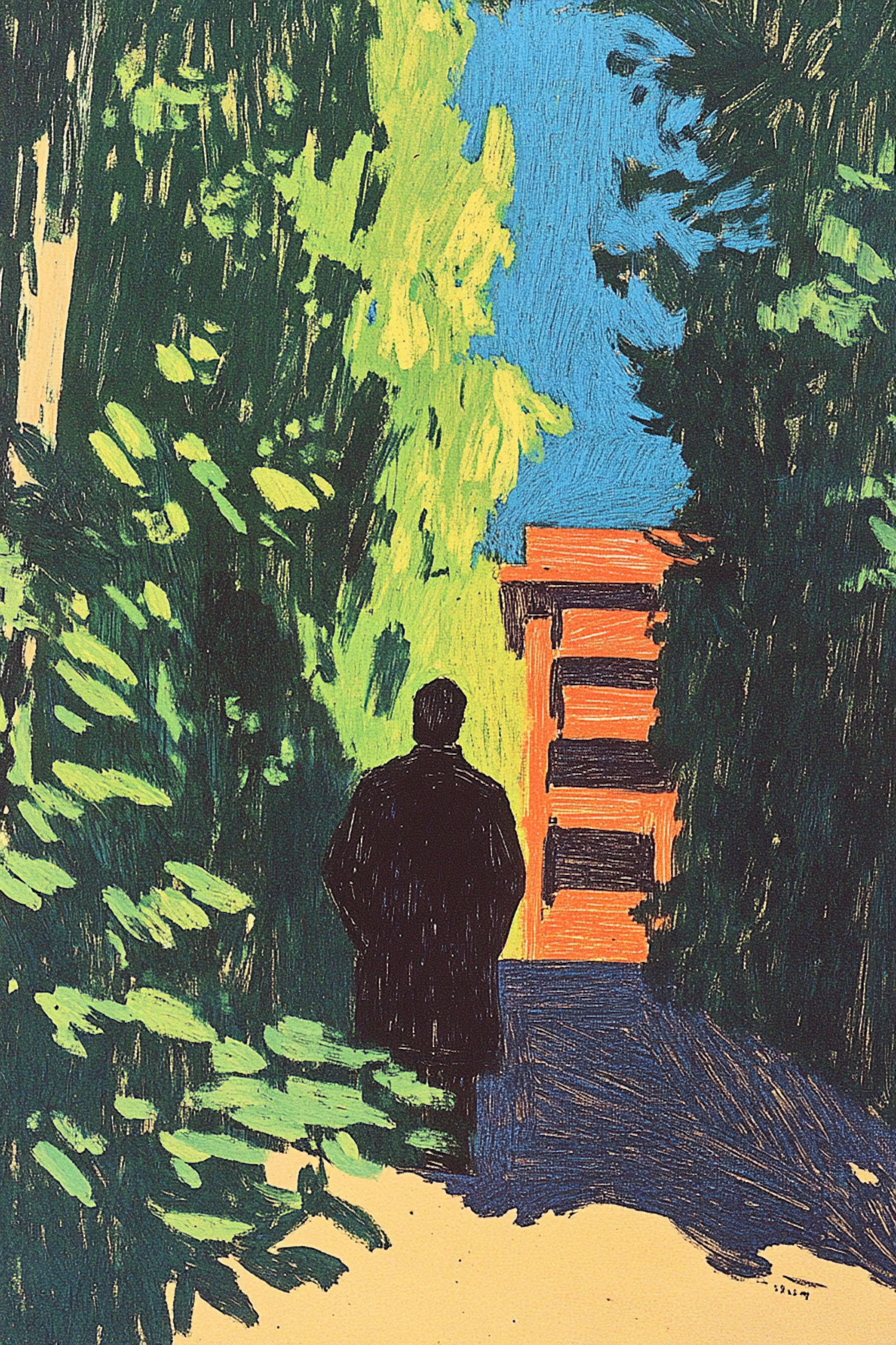 A vibrant illustration of a lone figure in a black coat walking through a green path with a red brick building in the background.