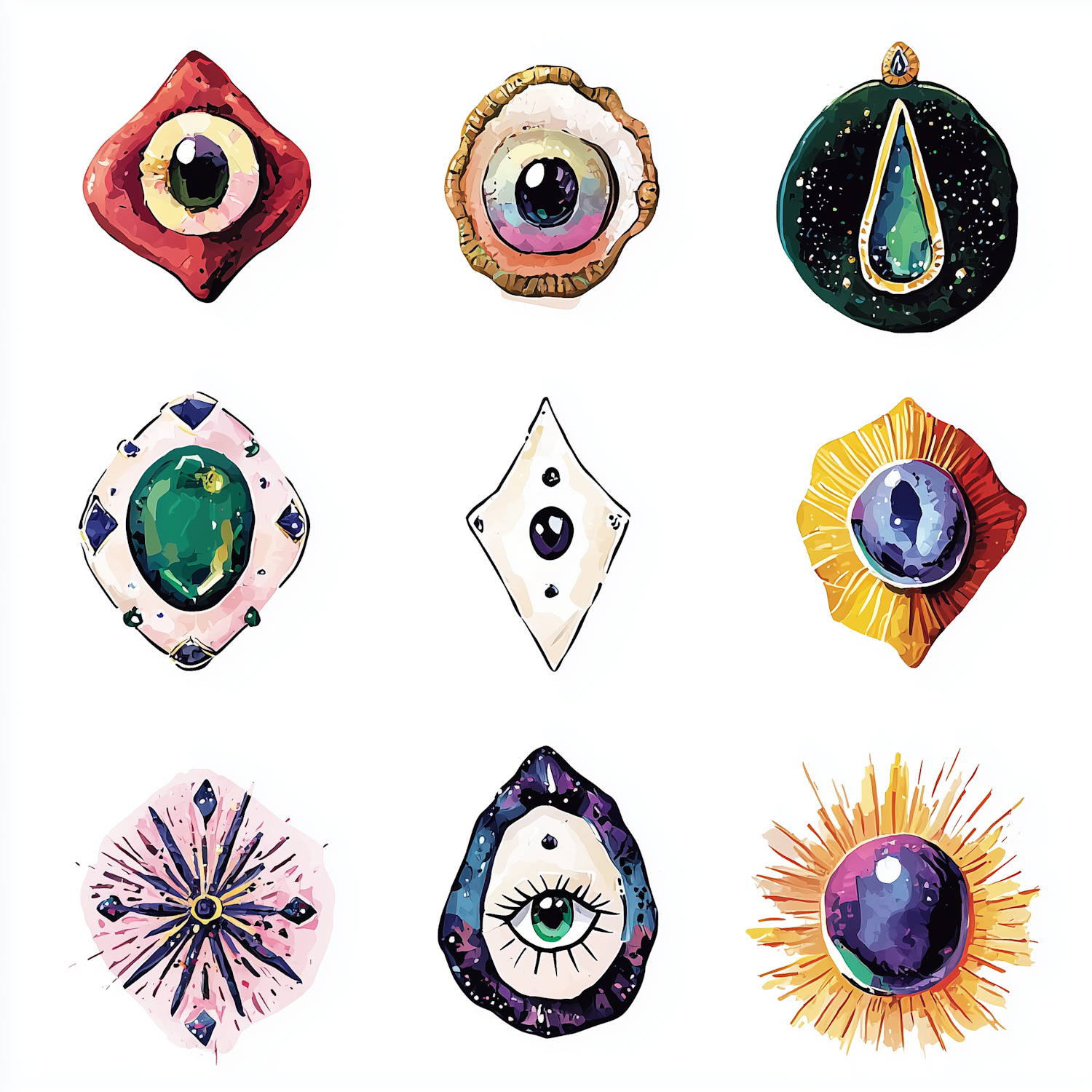 Nine mystical, abstract designs with cosmic and gemstone motifs in vibrant colors, arranged in a 3x3 grid.