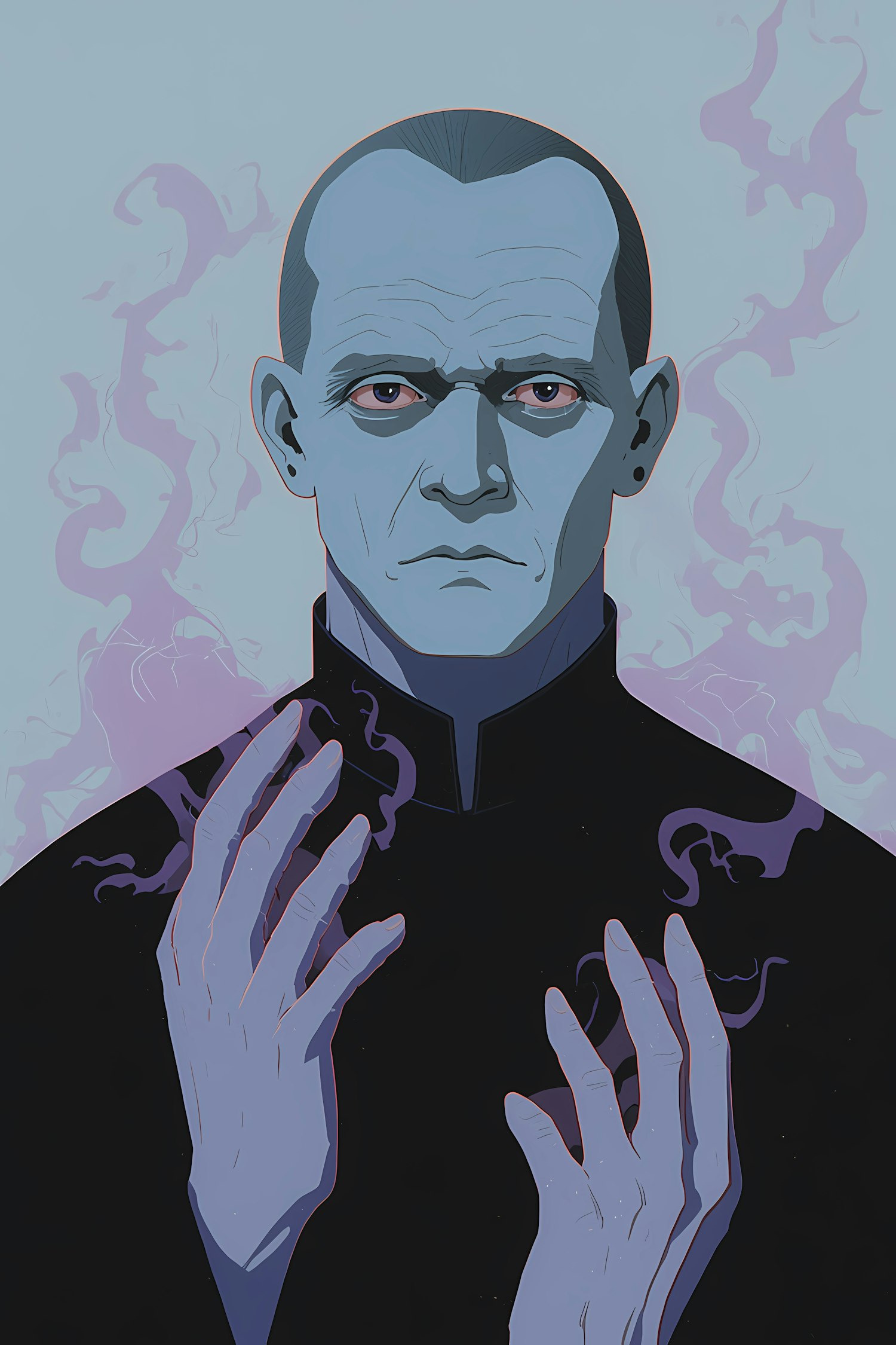 Illustration of a mystical figure with a pale blue complexion, dark attire, and ethereal energy emanating from their hands.
