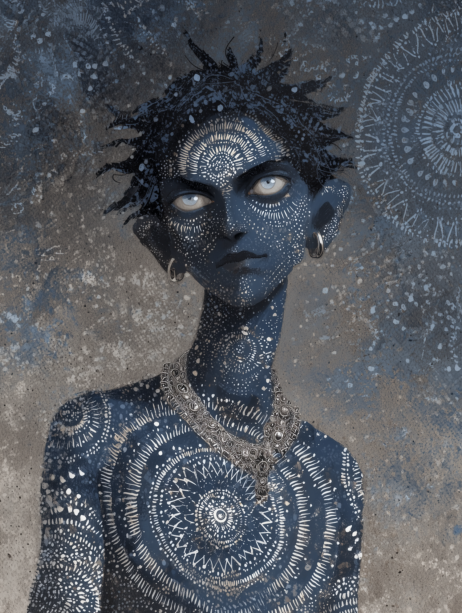 A stylized illustration of a blue-skinned figure with intricate white patterns, silver jewelry, and a textured abstract background.