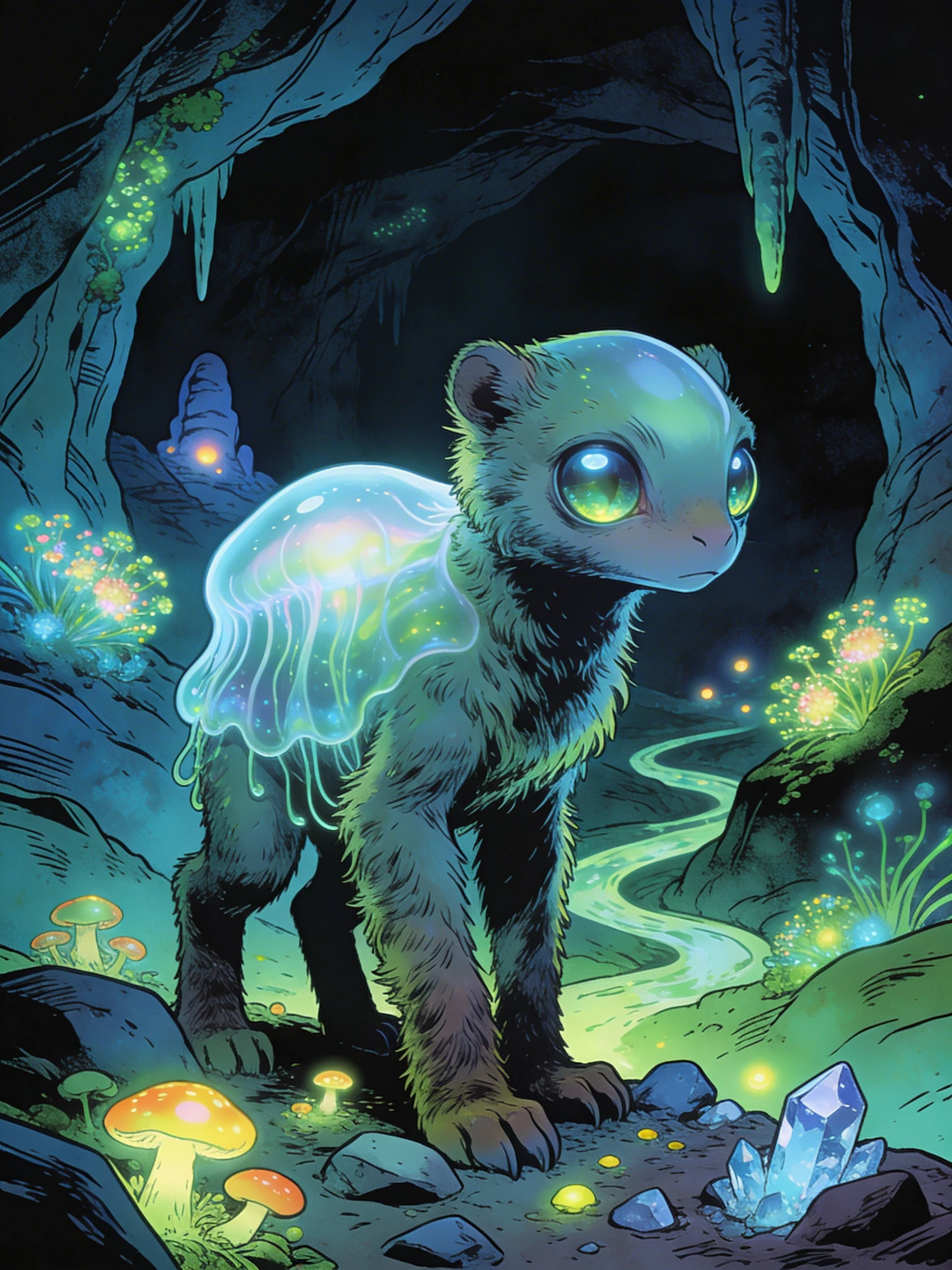 A glowing, mystical creature in a vibrant cave with bioluminescent mushrooms and crystals, creating a magical and ethereal atmosphere.
