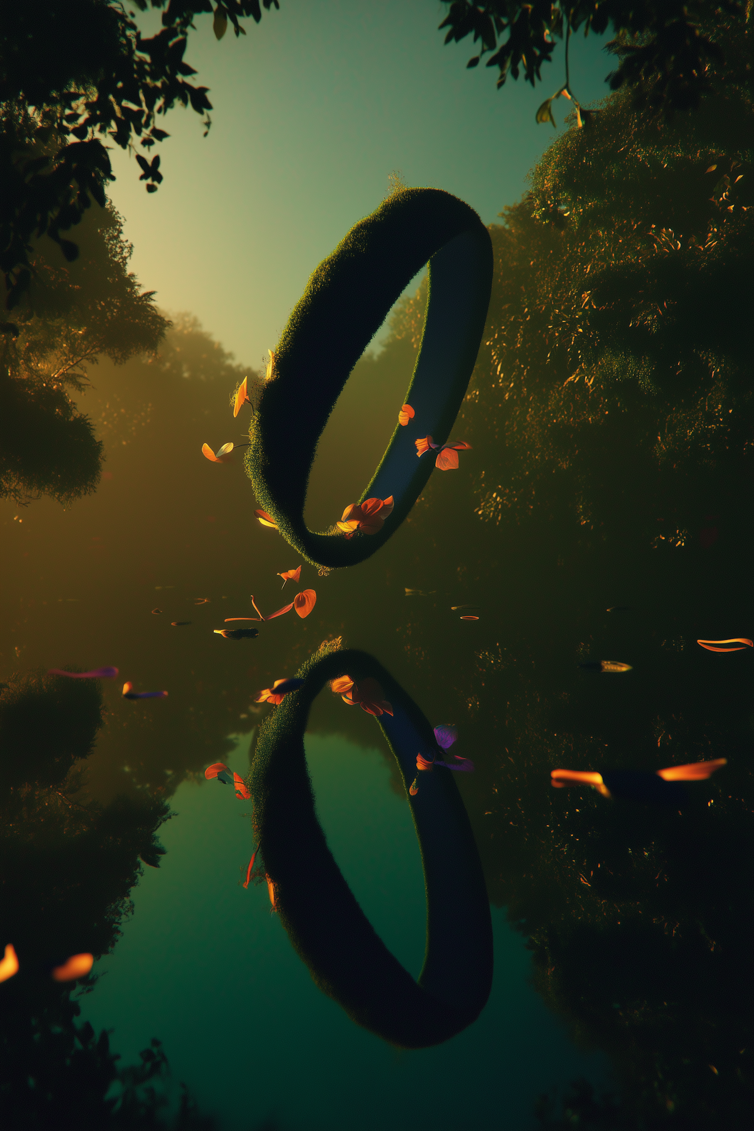 A surreal moss-covered ring floats above reflective water, surrounded by drifting petals, in a golden-lit forest setting.