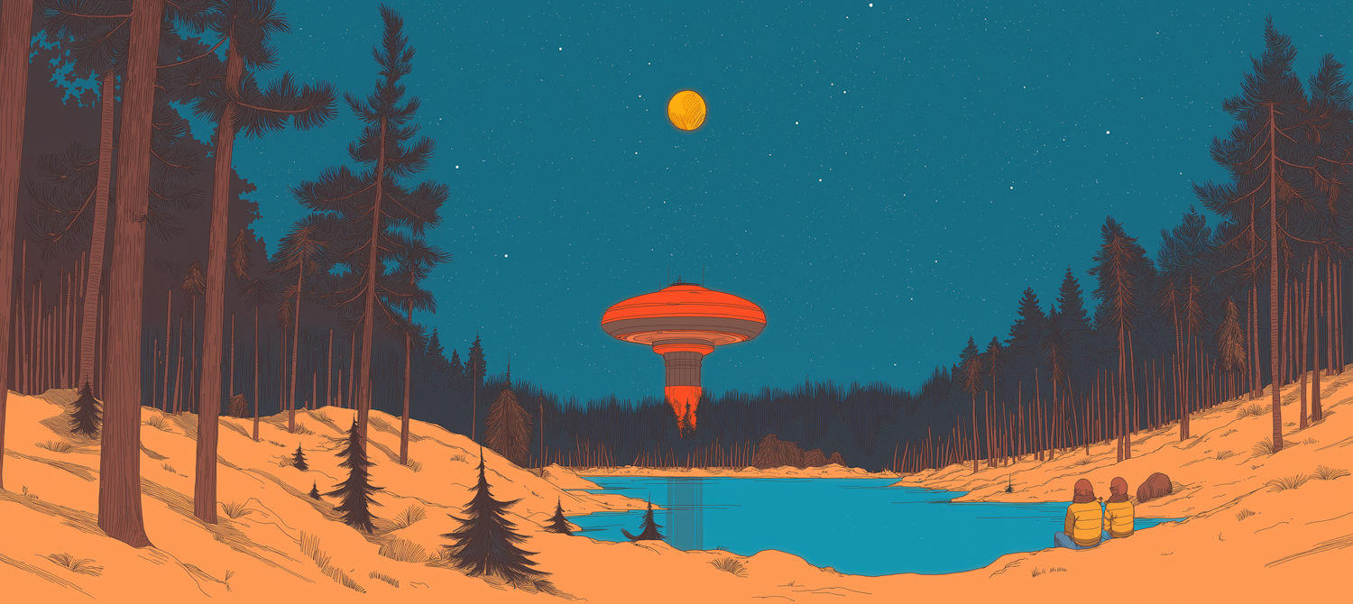 Illustration of a UFO hovering over a forest lake at night, with two people watching under a starry sky and full moon.