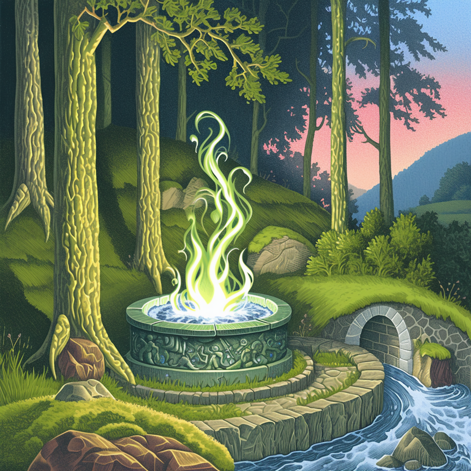 A magical forest scene with a glowing green flame rising from a carved stone well, surrounded by mossy stones and a flowing stream.