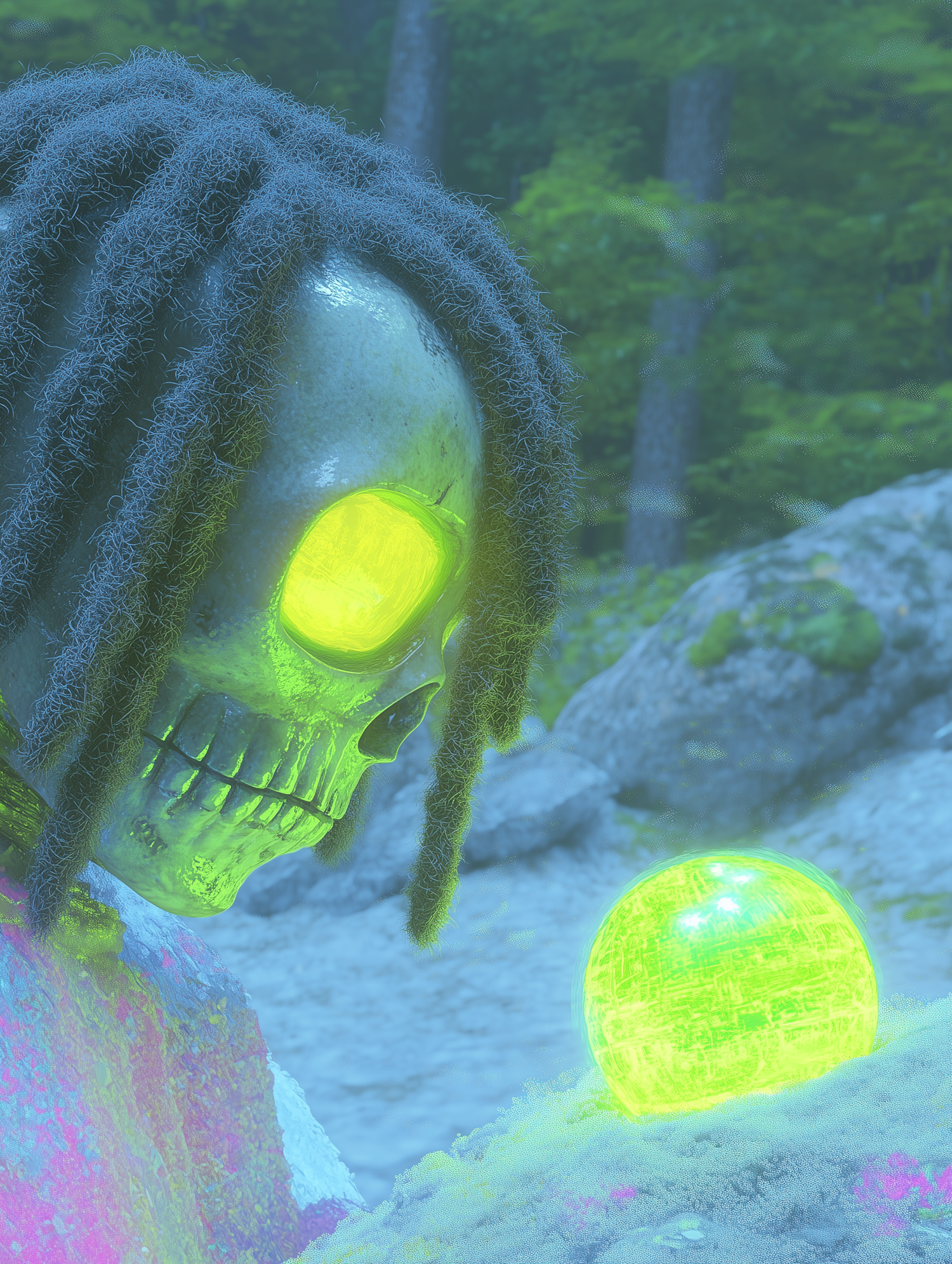 A glowing skeletal figure with green eyes examines a luminous orb in a vibrant, surreal forest setting.