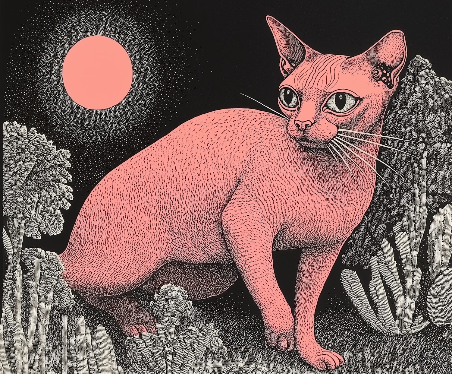 Surreal pink cat illustration with large eyes, textured skin, and a pink moon in a stylized landscape. Dreamlike and artistic.