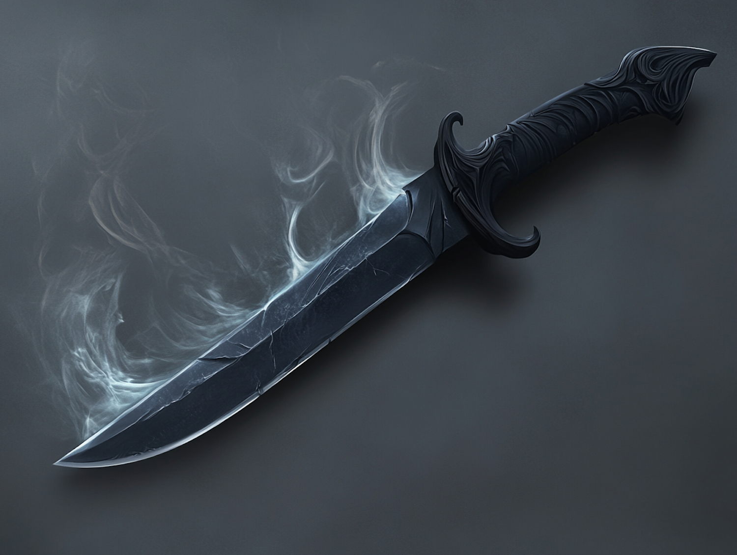 Dark, intricately designed dagger with a mystical aura, featuring a sharp blade and ornate handle against a dark gray background.