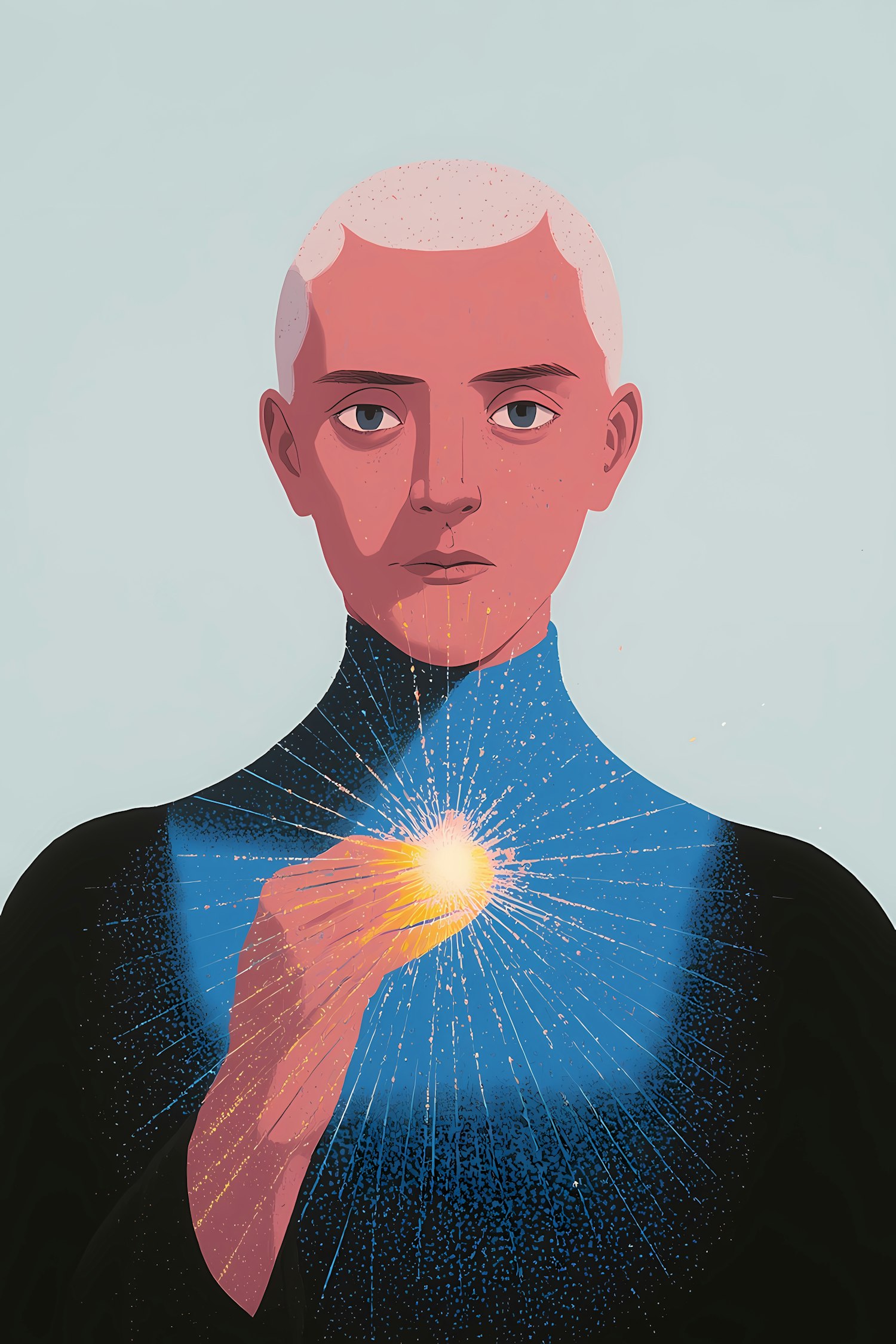Stylized illustration of a person holding a glowing orb, with radiant light beams and a serene expression, set against a pale blue background.