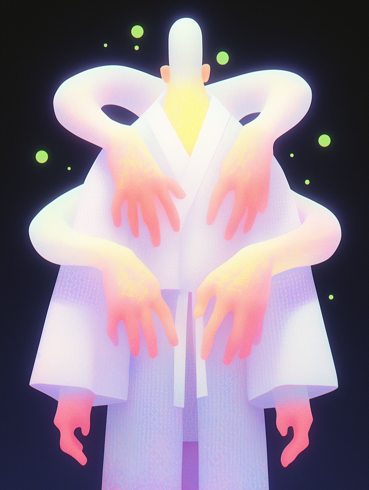 A surreal illustration of a humanoid figure with multiple glowing arms, dressed in white, set against a dark background with floating green orbs.