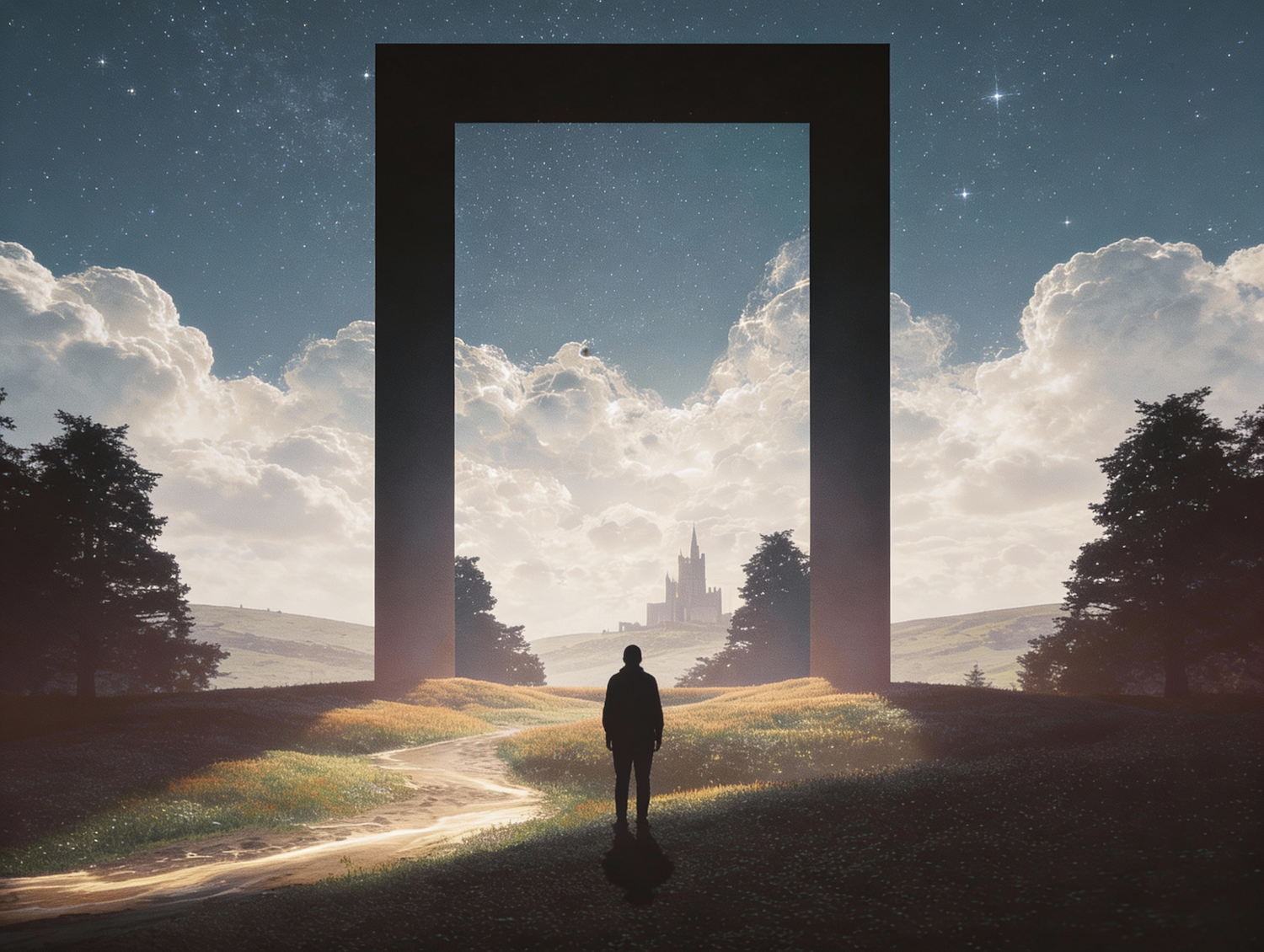 A lone figure stands under a massive archway, gazing at a distant castle amidst a surreal landscape of clouds and stars.