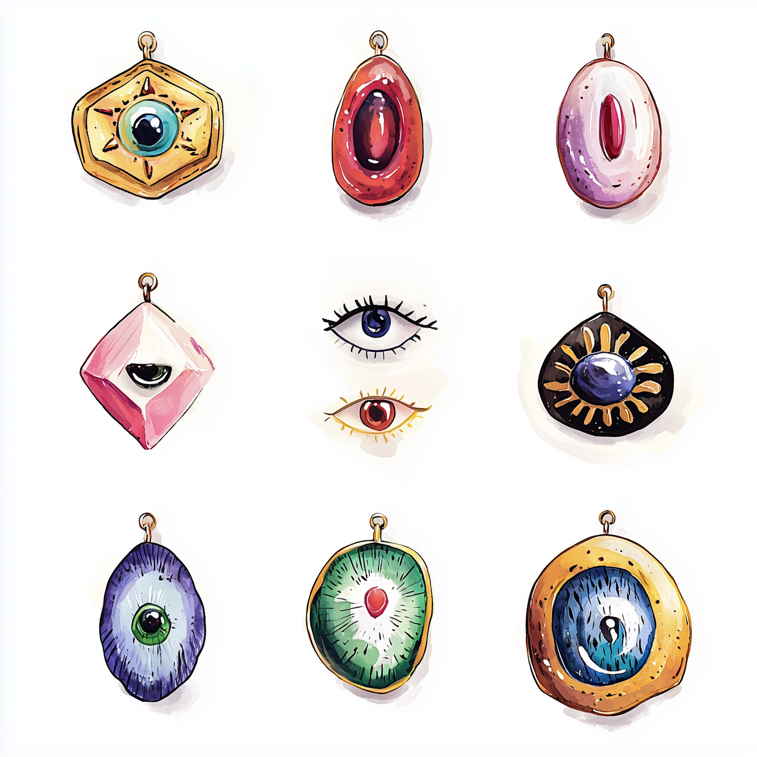 A vibrant grid of mystical pendants with eye motifs, featuring unique shapes, colors, and intricate designs. Perfect for fantasy lovers.