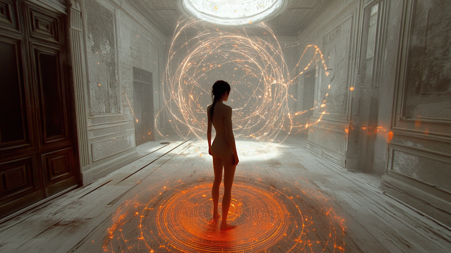 A mystical scene with a person surrounded by glowing orange symbols in an ornate room, creating an enchanting atmosphere.