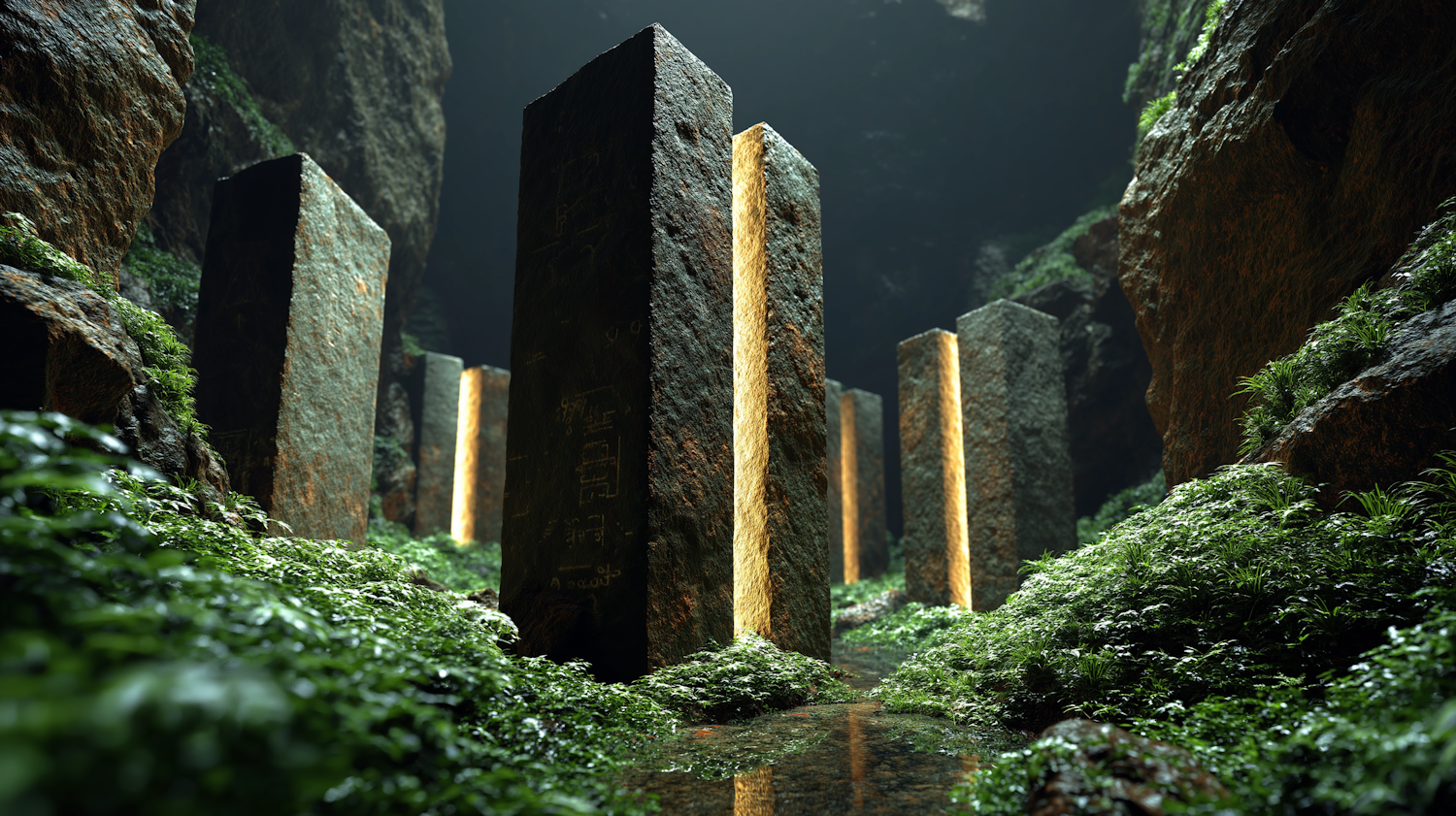 Ancient glowing monoliths in a lush, green cavern with moss and a reflective stream, creating a serene and mystical atmosphere.
