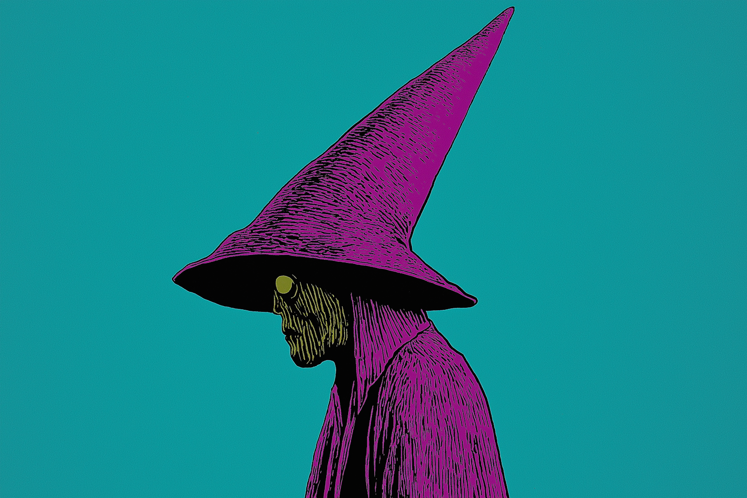 Stylized illustration of a mysterious figure in a purple hat and cloak against a teal background, featuring bold colors and shapes.