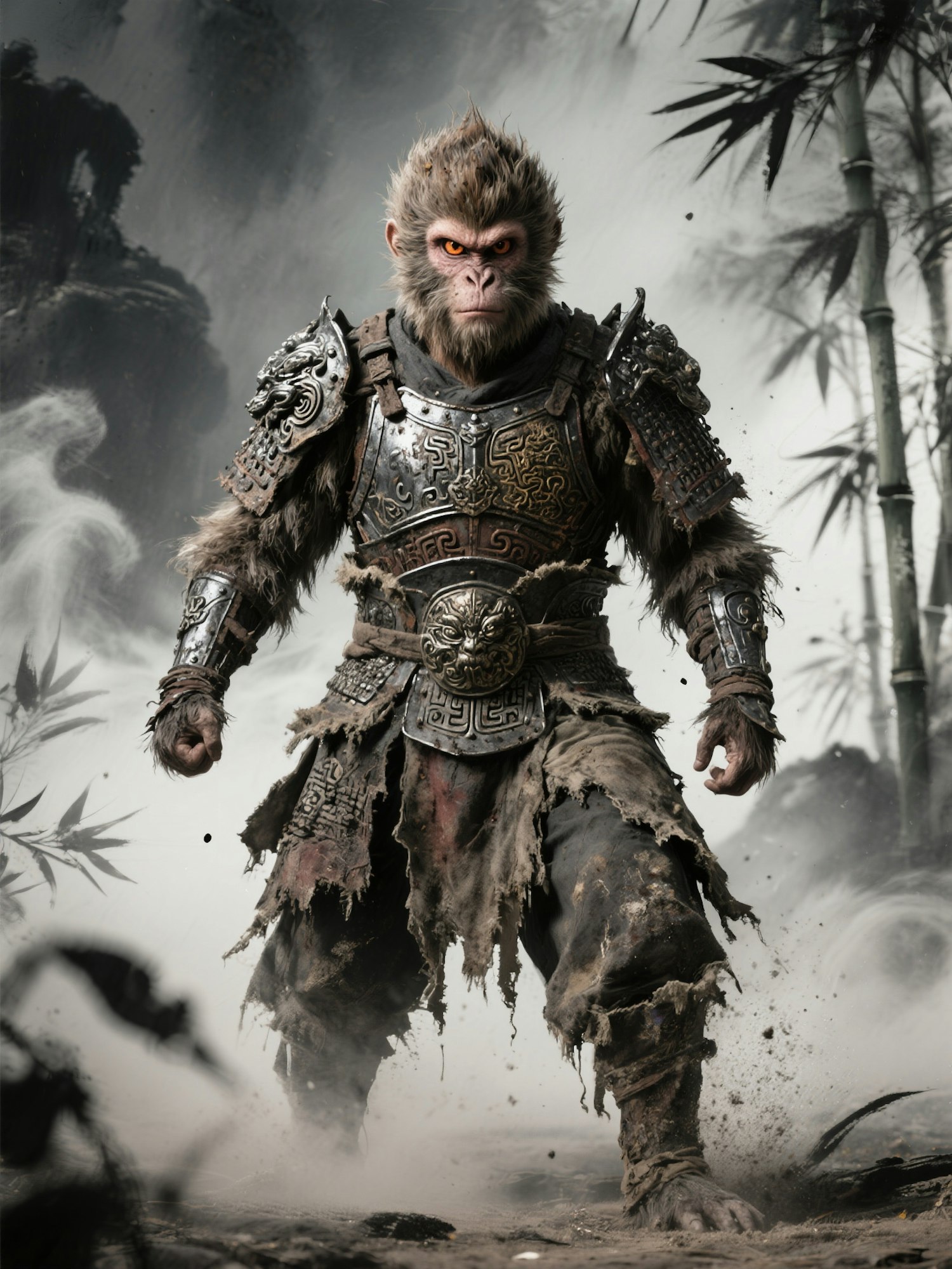 A weathered monkey warrior in tattered armor, eyes burning with determination, Chinese ink painting meets photoreal textures.