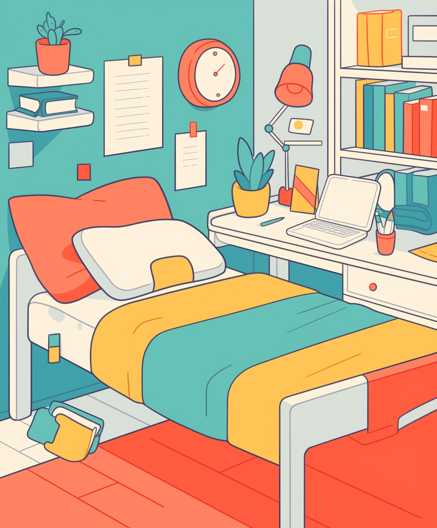 A cozy bedroom with a teal and yellow theme, featuring a bed, desk, laptop, and shelves. Vibrant and organized space.
