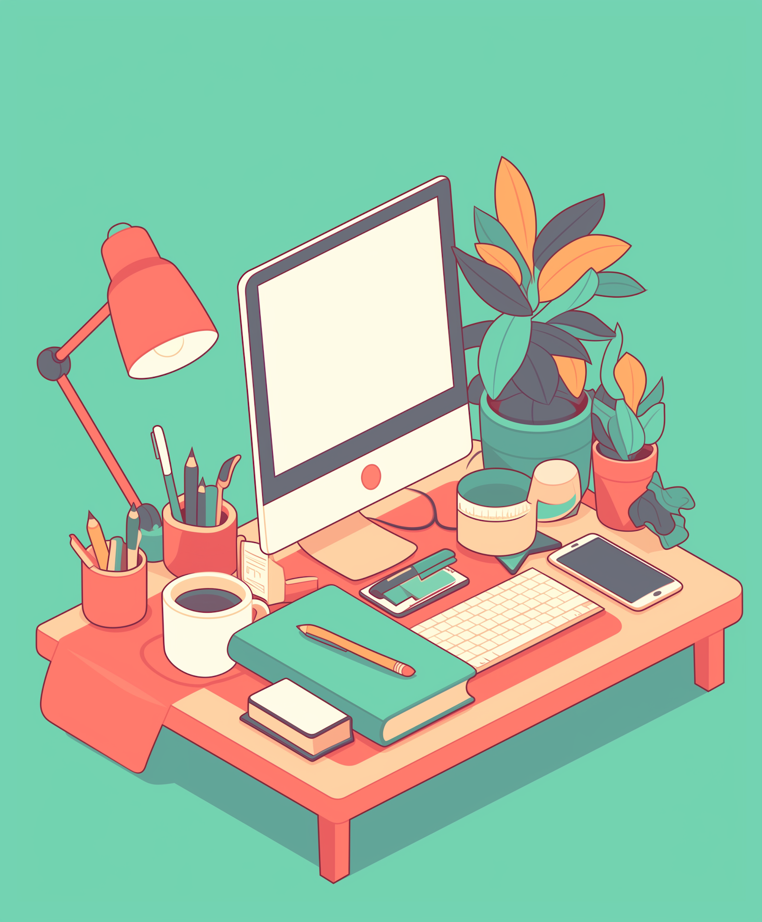 Colorful workspace illustration with a computer, plants, and stationery on a wooden desk against a teal background.