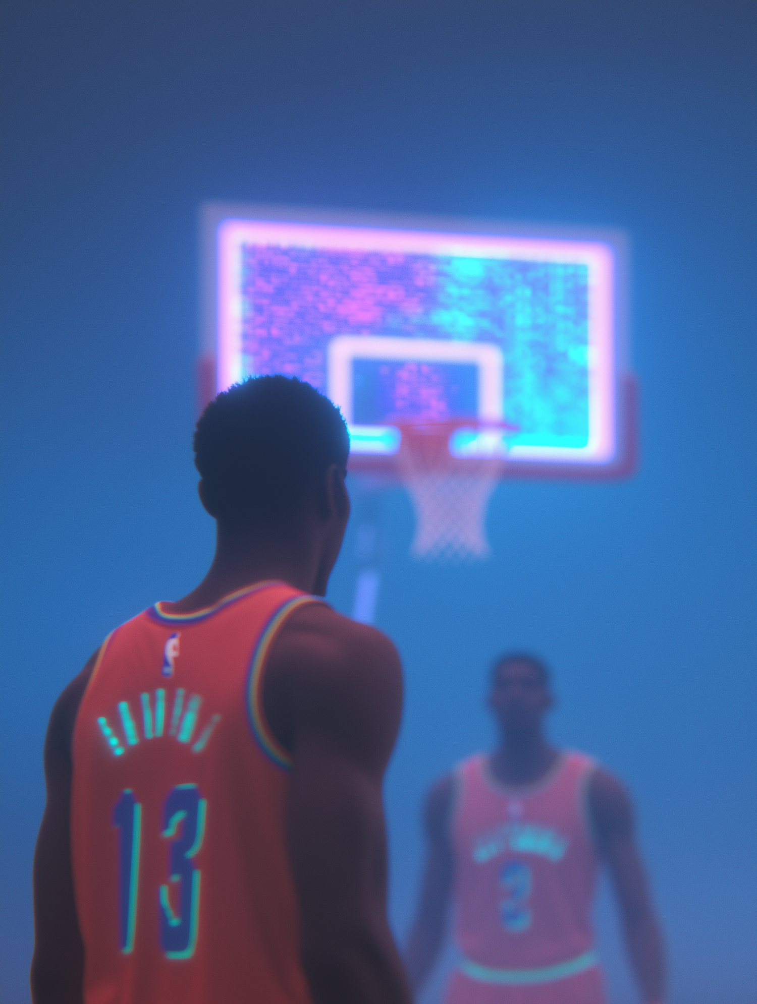 Two basketball players in neon-lit jerseys face each other in a blue-hued, atmospheric setting with a glowing hoop.
