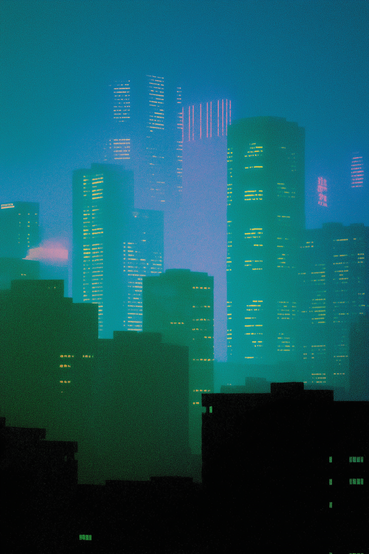 A misty cityscape with neon-lit skyscrapers in teal and purple hues, creating a futuristic and atmospheric urban scene.