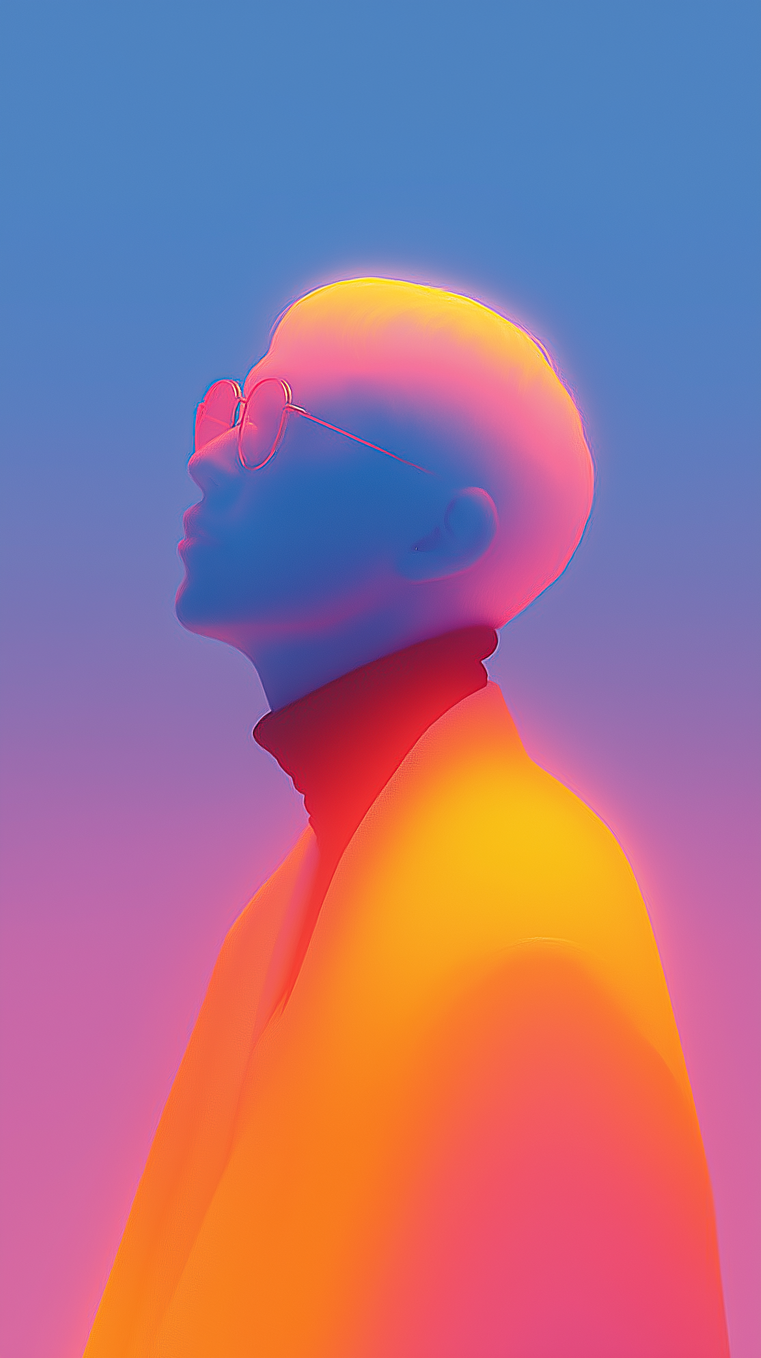 A vibrant digital artwork of a person in profile, glowing with neon hues of pink, orange, and blue, set against a gradient background.