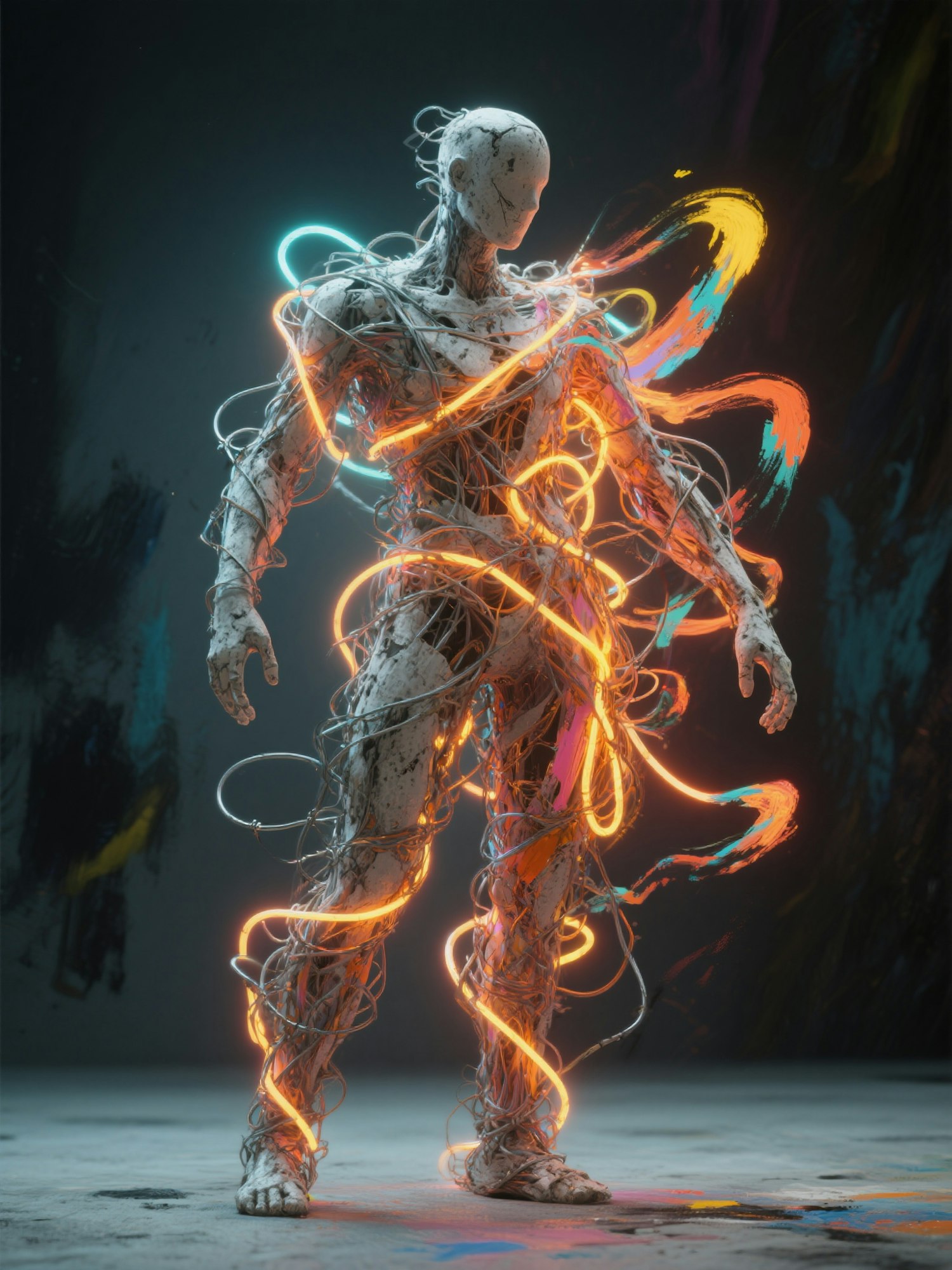 A futuristic humanoid figure wrapped in glowing neon wires, standing against a dark, abstract background with vibrant splashes of color.