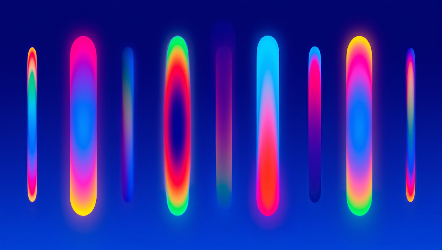 Bright neon gradients in vertical ovals glow against a deep blue background, creating a futuristic and abstract digital art piece.