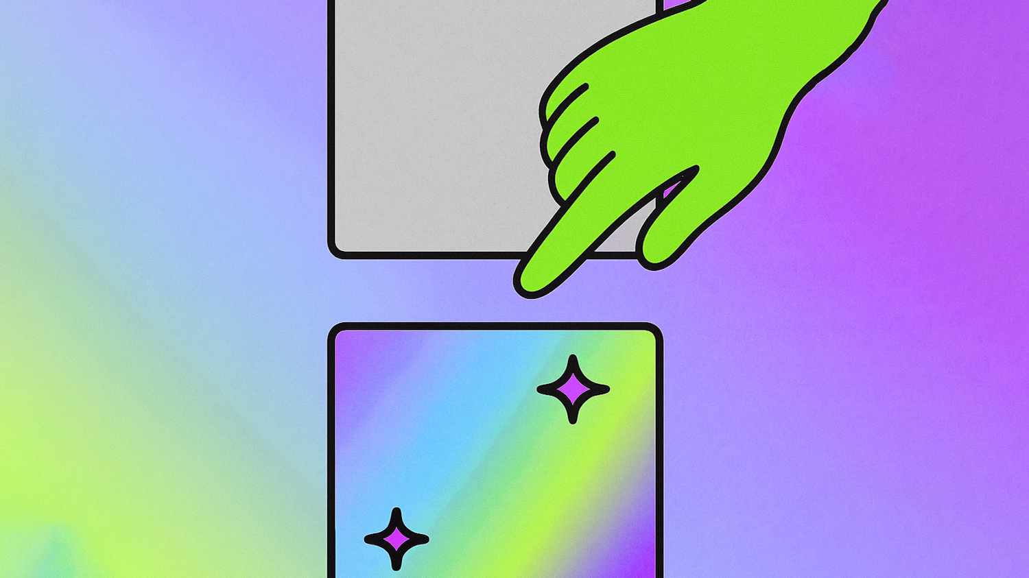 Bright illustration of a neon green hand pointing at a colorful, sparkly card on a pastel gradient background. Modern and vibrant design.