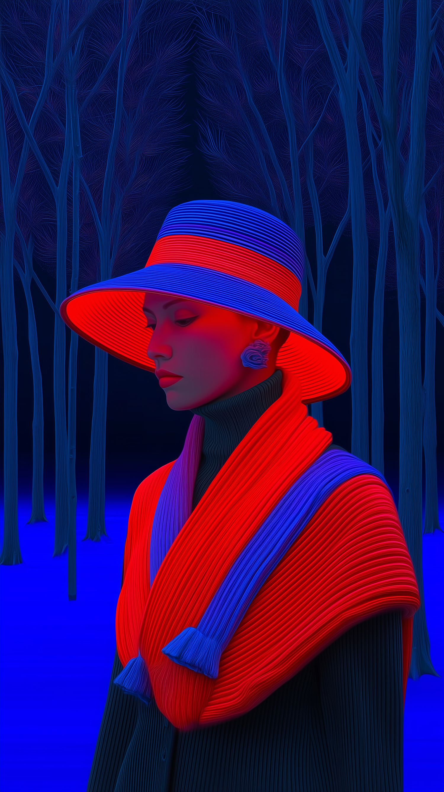 Stylized neon illustration of a person in a hat and scarf, set against a dark forest background with vibrant red and blue tones.