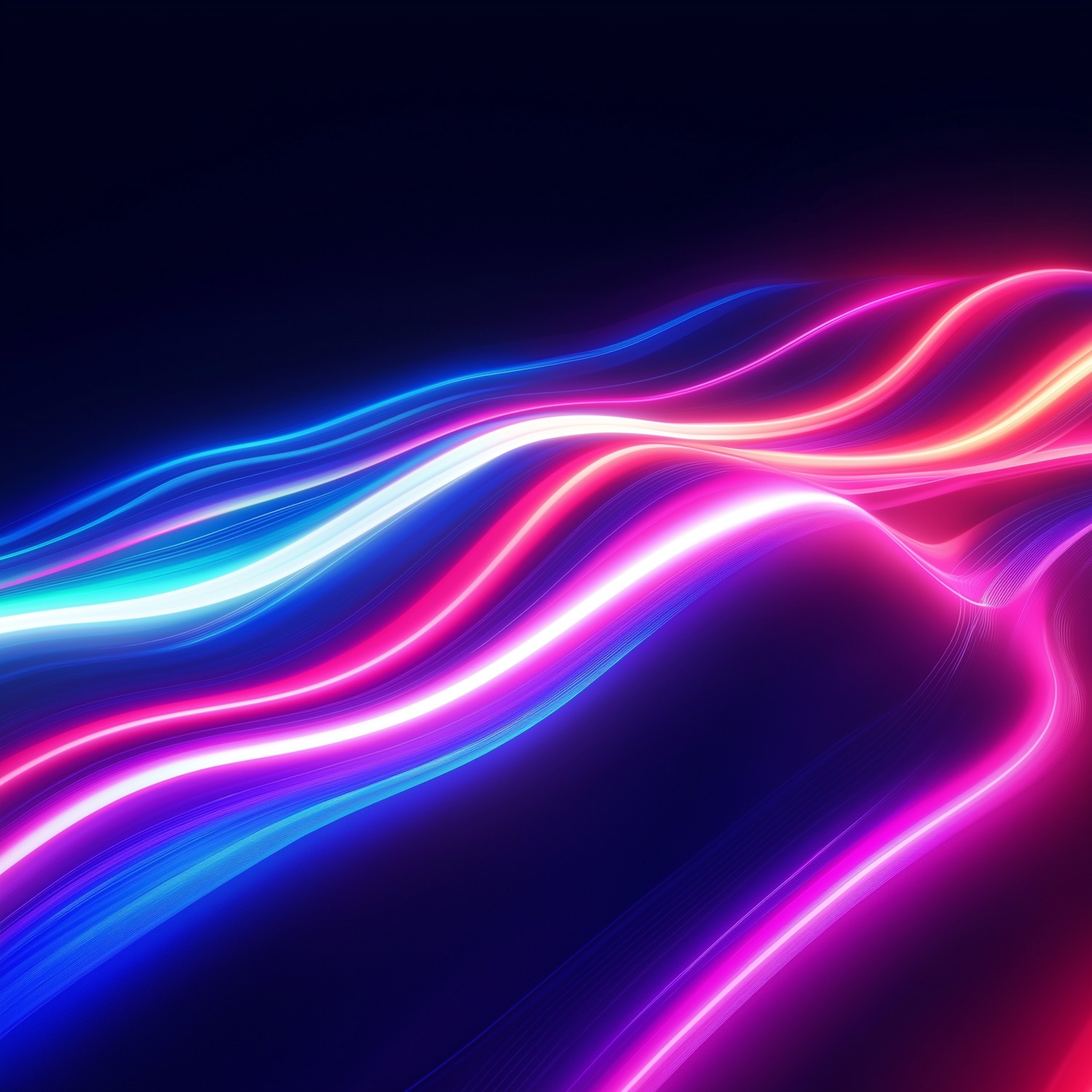 Vibrant neon light trails in pink, blue, and purple flow smoothly on a dark background, creating a futuristic and dynamic abstract design.