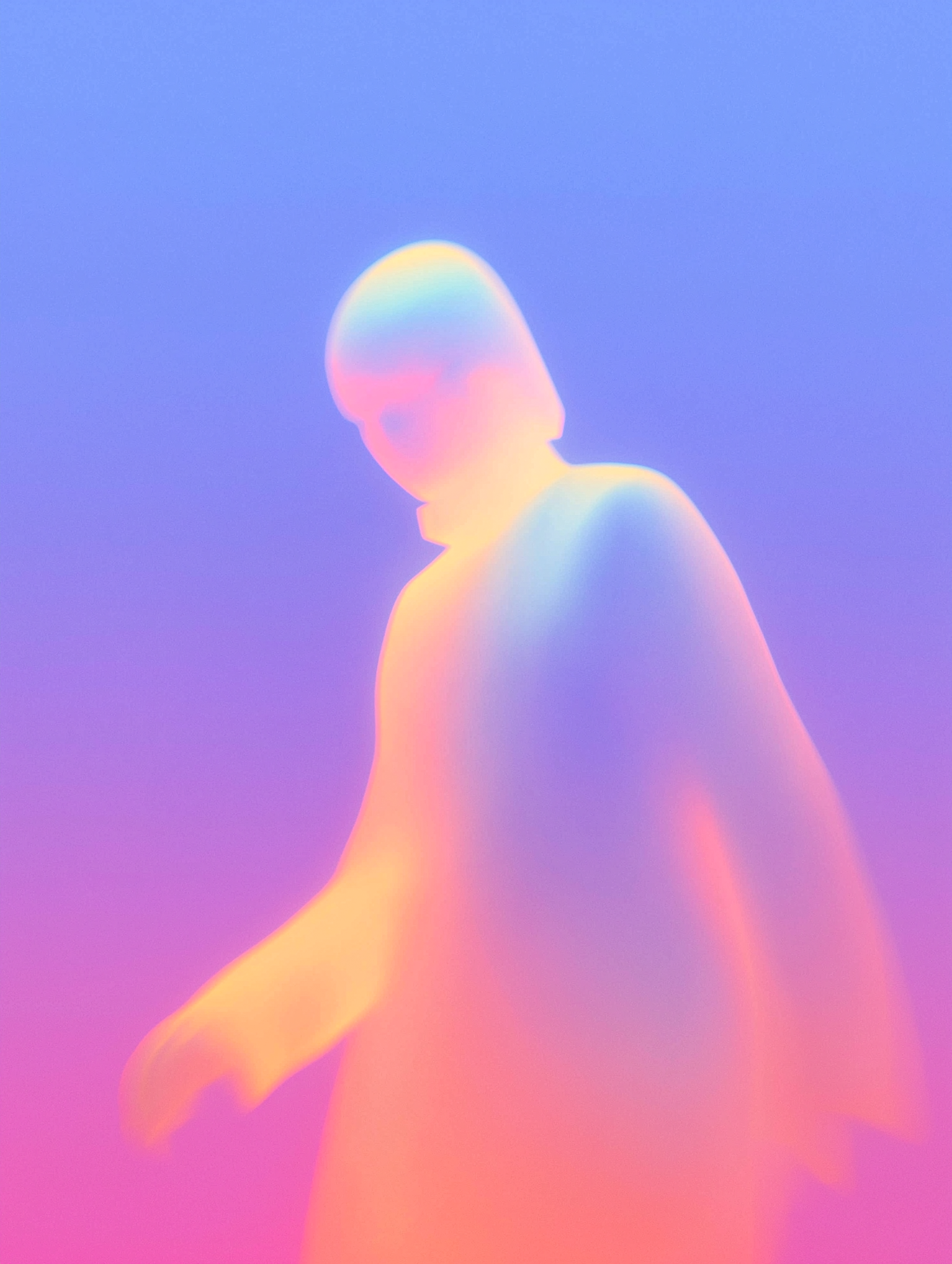 Abstract neon gradient figure blending pink, orange, and blue hues, creating a dreamlike and ethereal visual effect.