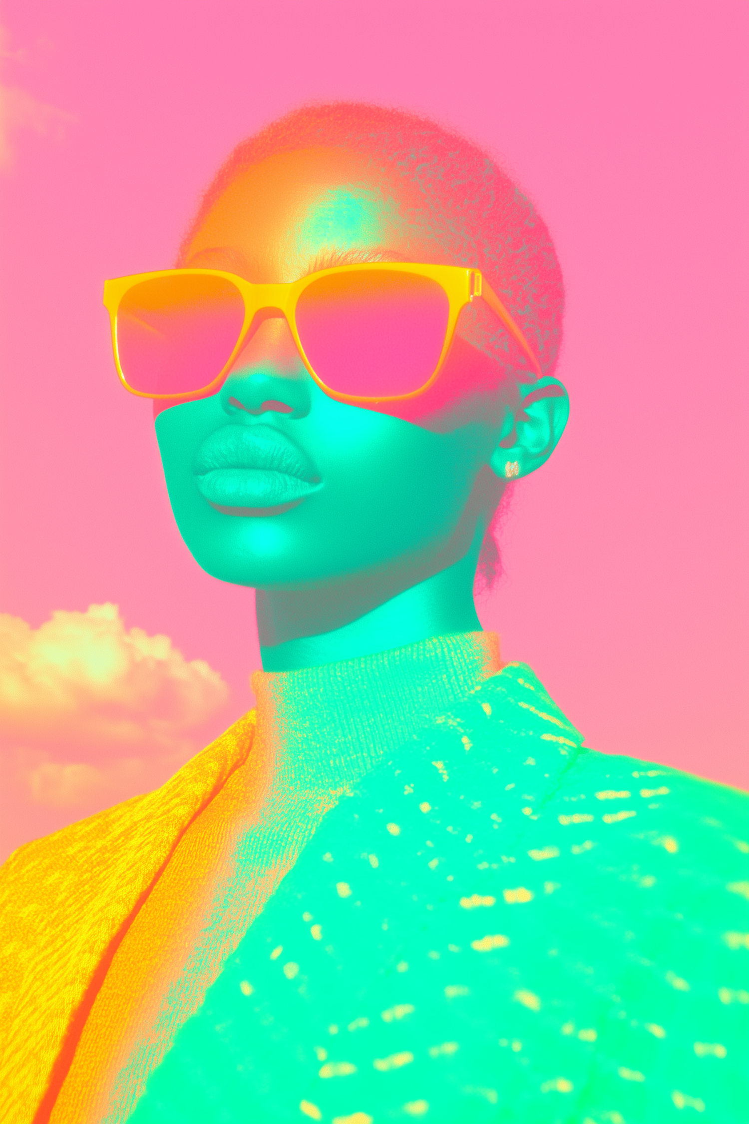 Vibrant pop-art style image of a person with yellow sunglasses against a pink and orange gradient background.