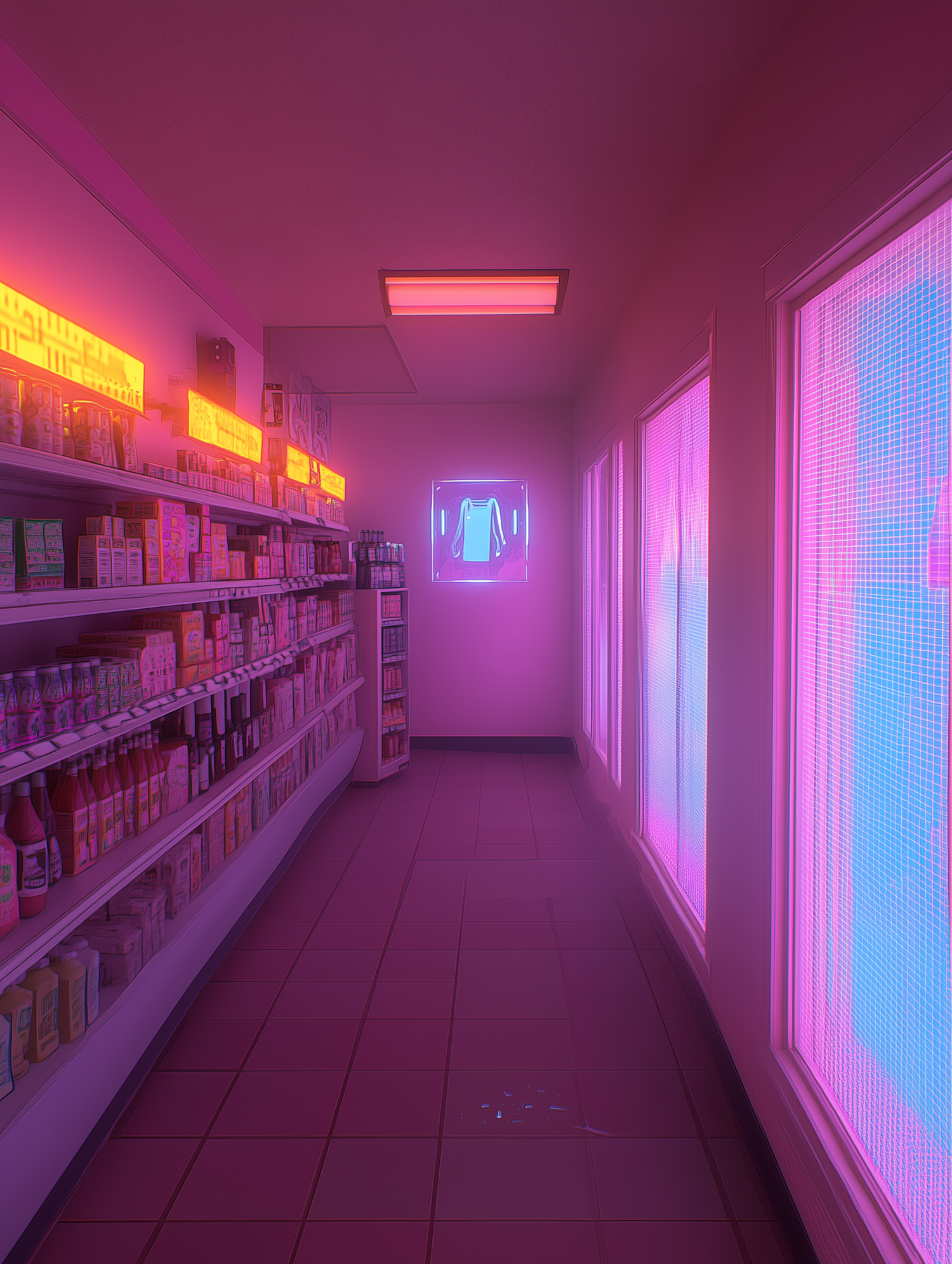 Neon-lit convenience store aisle with vibrant pink and blue hues, creating a futuristic and surreal atmosphere.