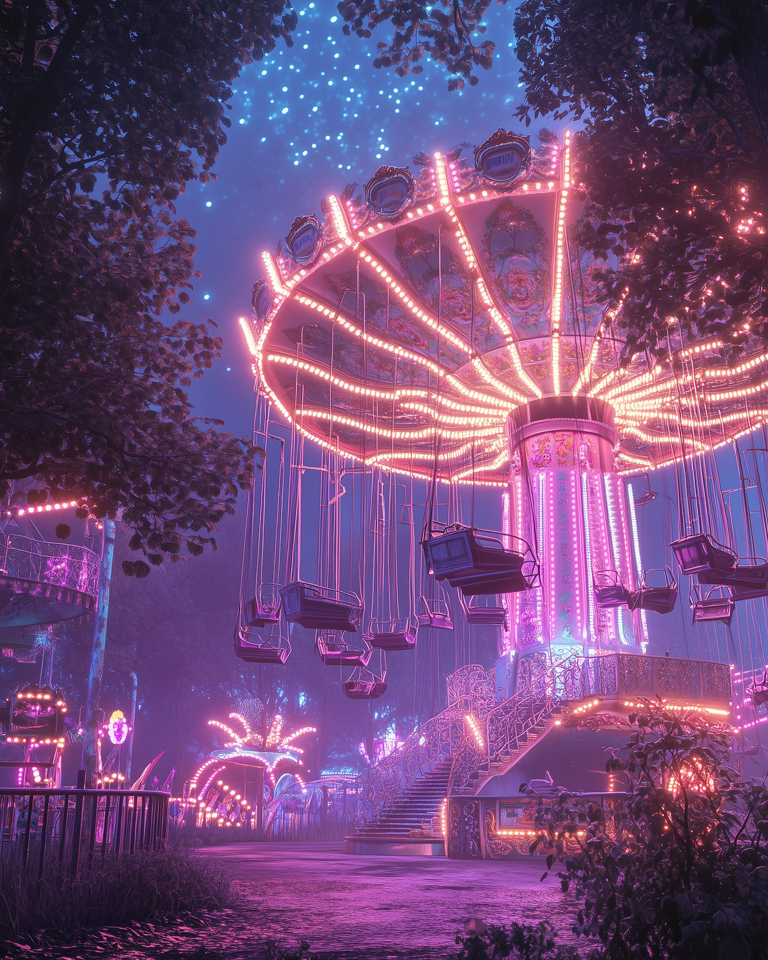 A neon-lit swing carousel at night in a magical amusement park, surrounded by glowing attractions and a starry sky.