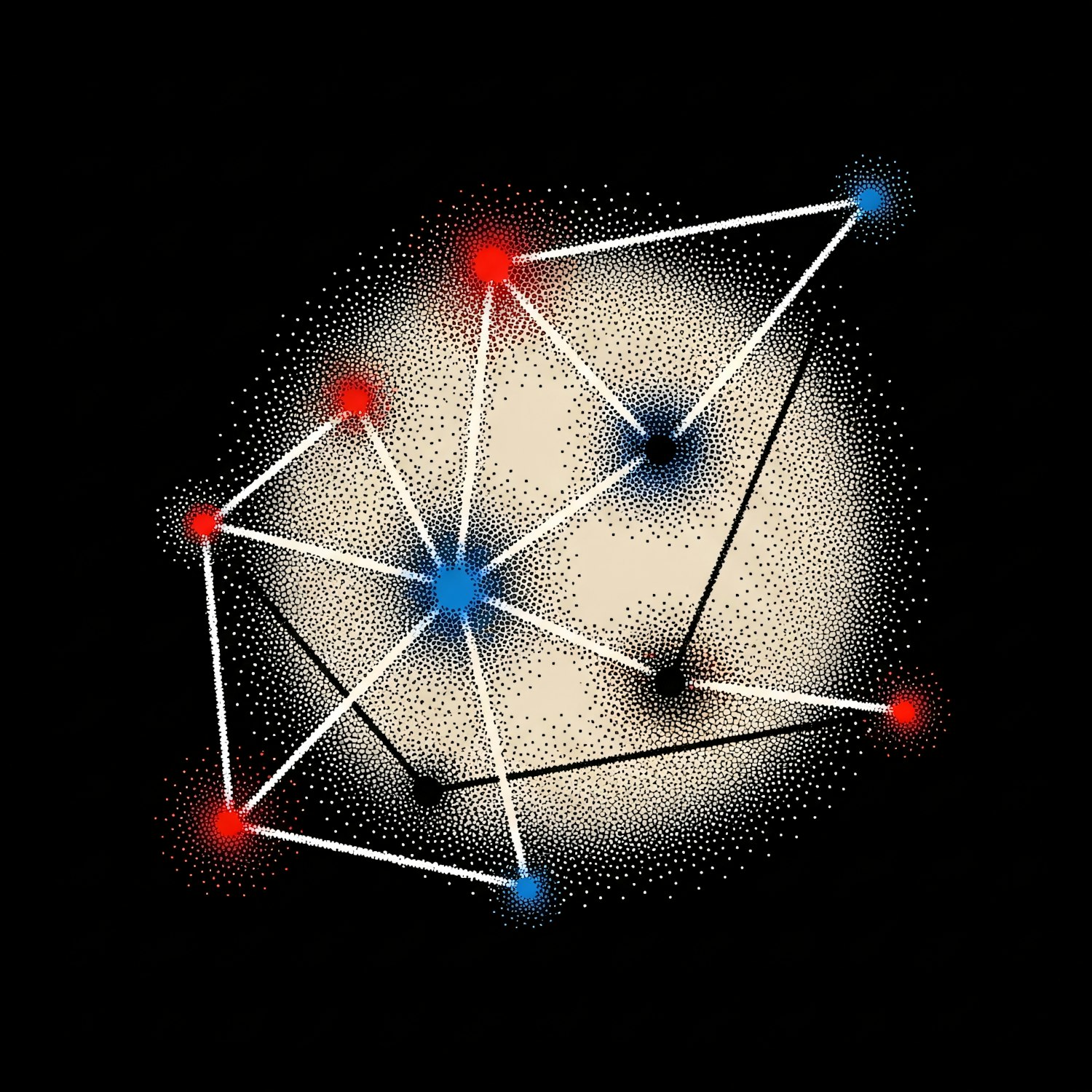 Abstract illustration of a network with red and blue nodes connected by white lines, set against a black background with dotted gradients.
