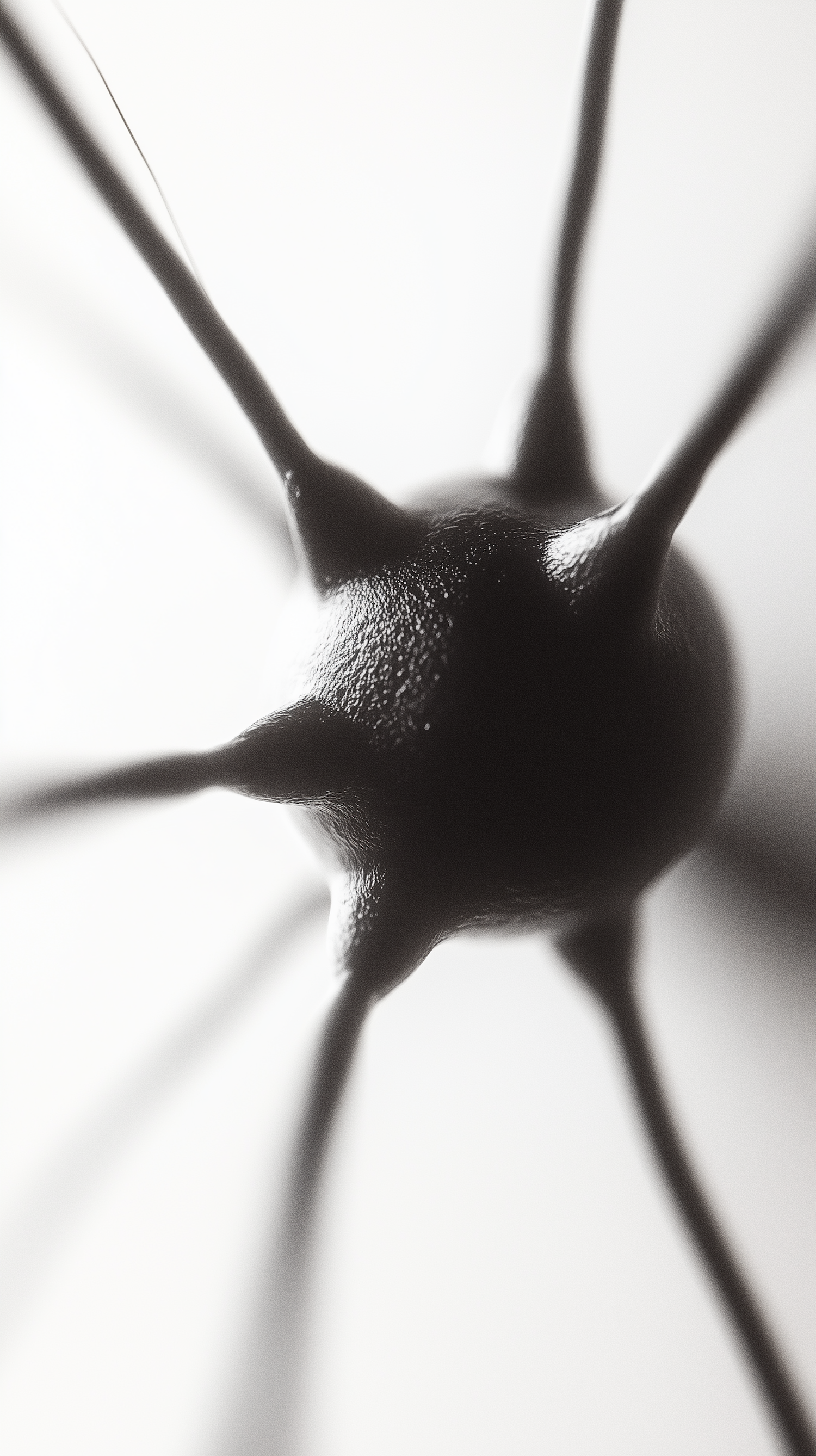 Monochromatic close-up of a neuron-like structure with textured body and radiating extensions, set against a softly blurred background.