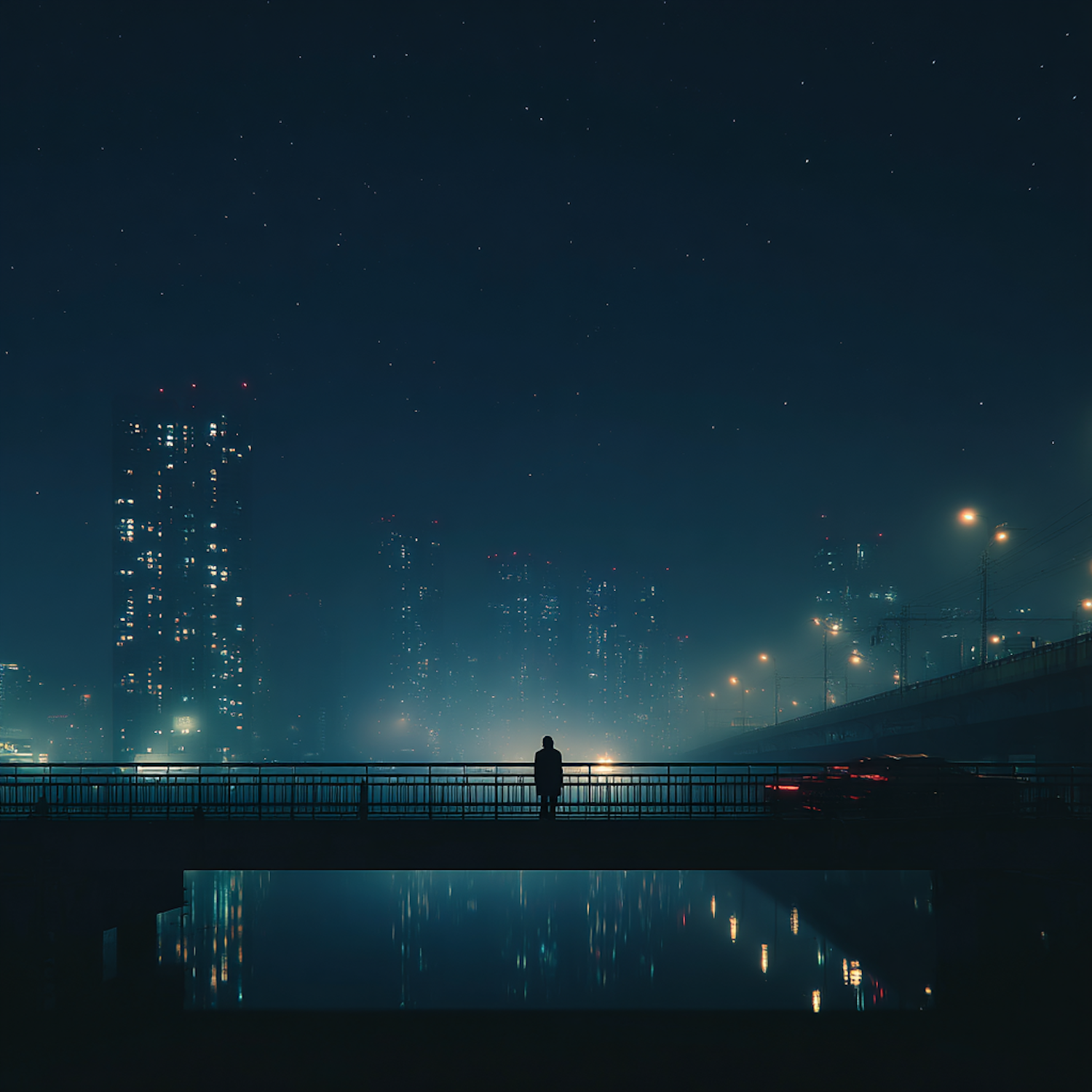A lone figure stands on a bridge at night, surrounded by a misty cityscape with glowing lights and reflections on the water below.