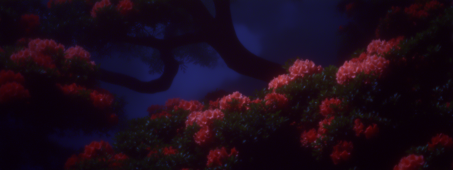 A serene nighttime scene with vibrant red flowers on lush green foliage, contrasted against a deep blue background and dark tree branches.