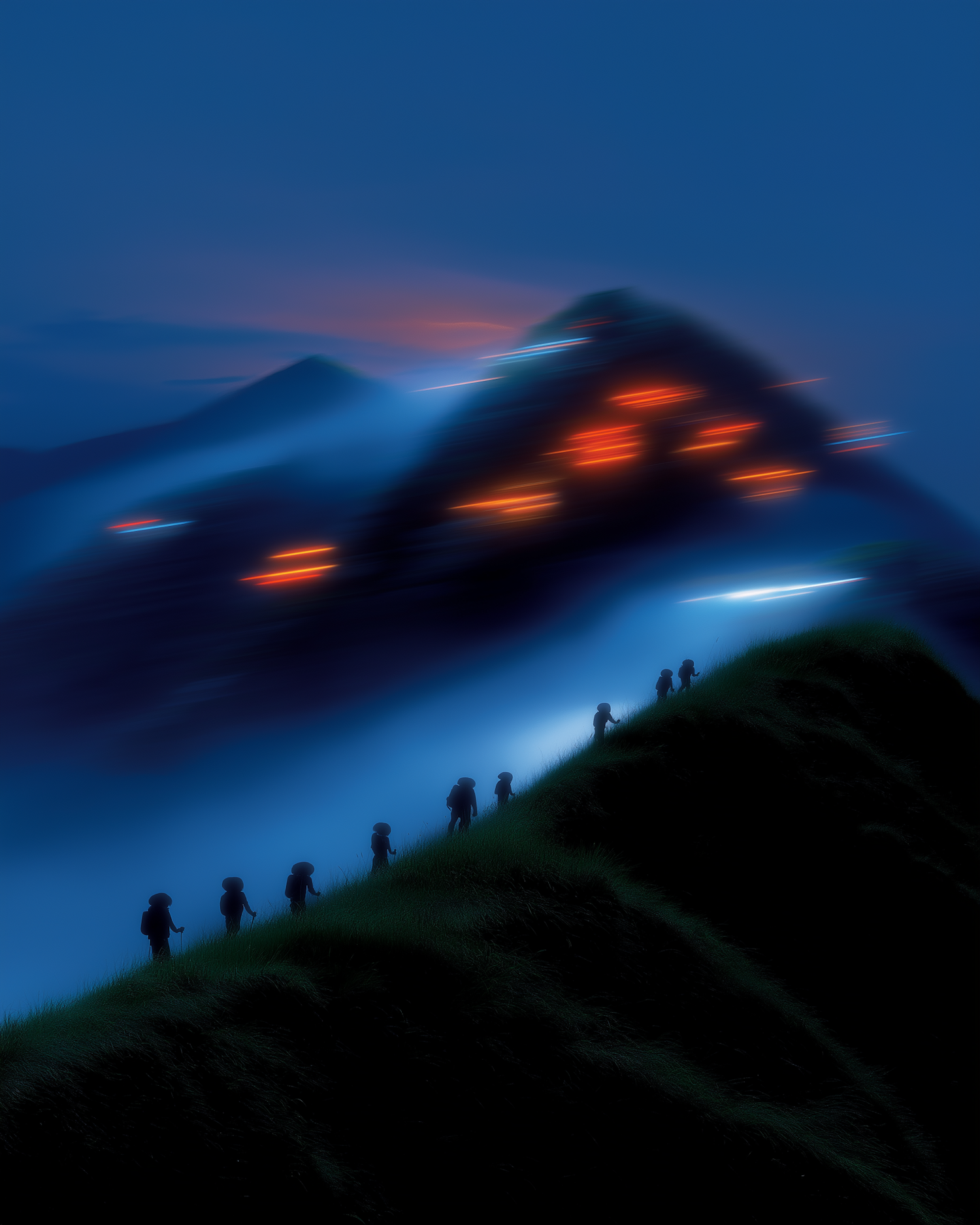 A surreal scene of figures climbing a grassy hill at night, with glowing lights illuminating a distant mountain under a deep blue sky.