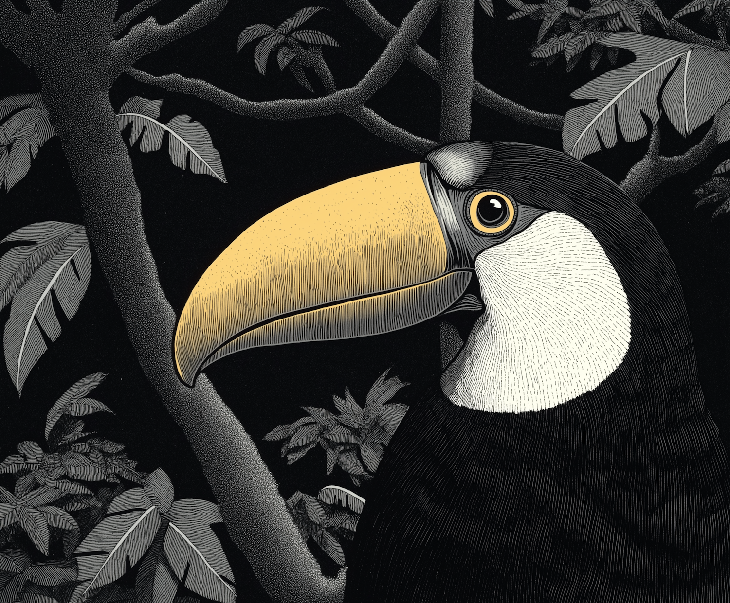 Elegant toucan illustration with a vivid yellow beak and intricate details, set against a dark, textured background with stylized foliage.