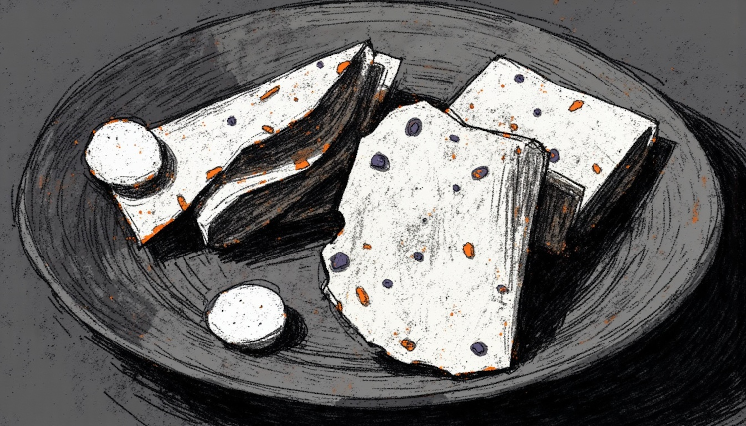 Illustrated plate of nougat candy with colorful bits, drawn in a textured, sketch-like style on a muted gray background.