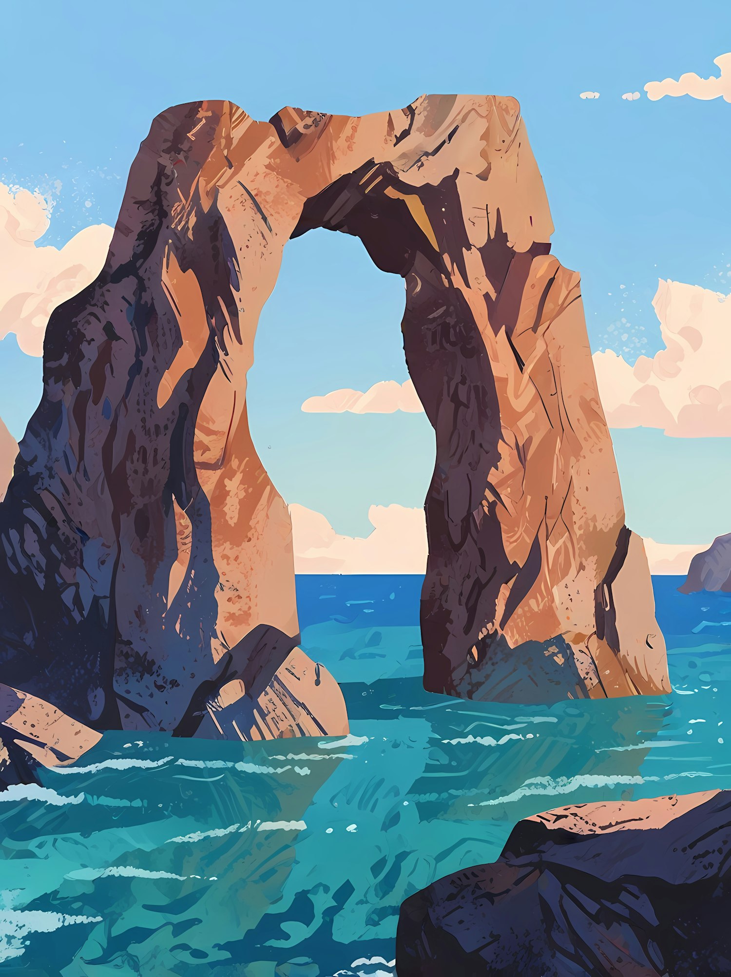 Vivid illustration of a natural rock arch over turquoise waters, set against a clear blue sky with scattered clouds.