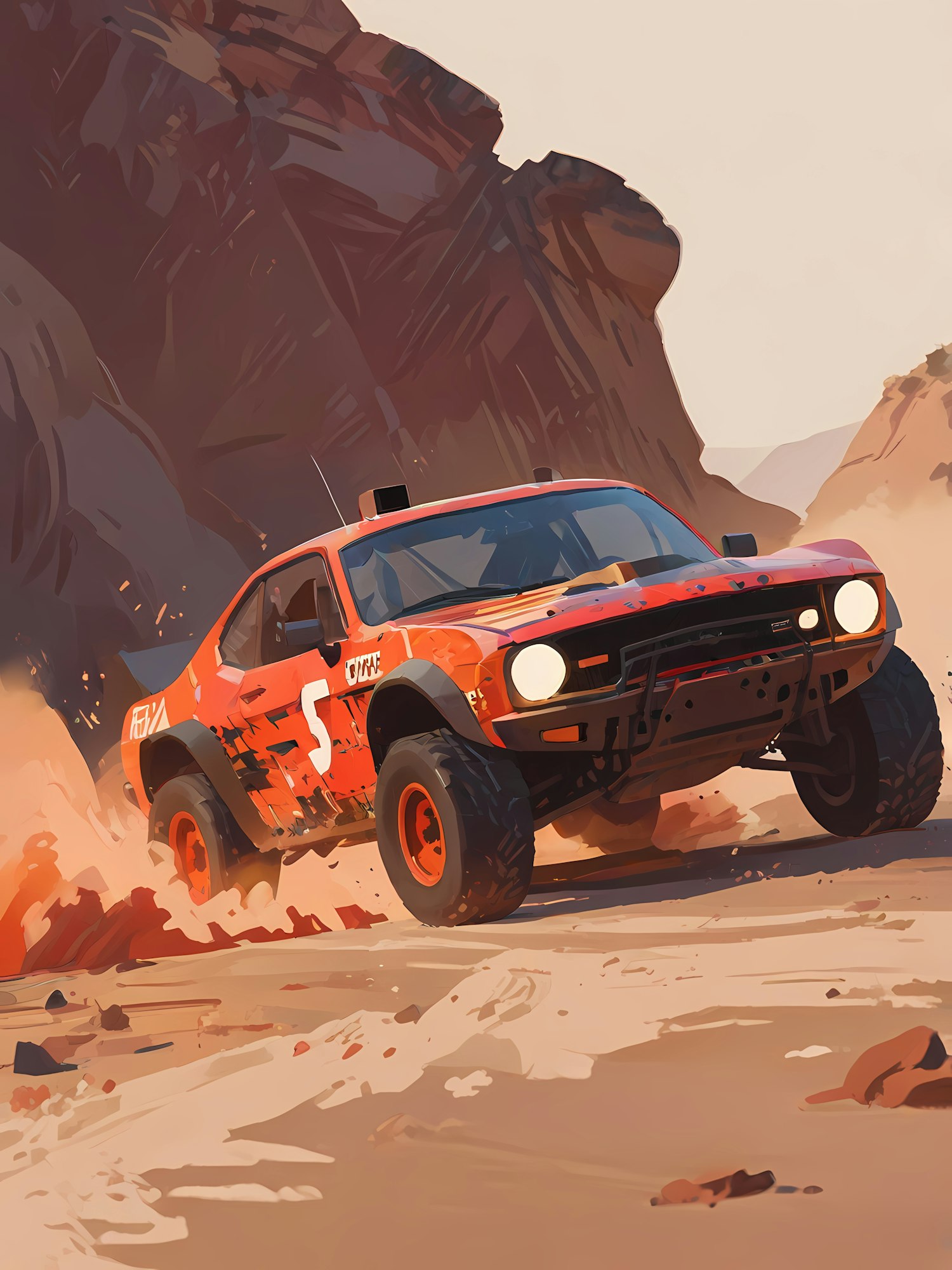 Vivid illustration of a red rally car speeding through a desert, kicking up dust against a backdrop of rugged cliffs and sandy terrain.