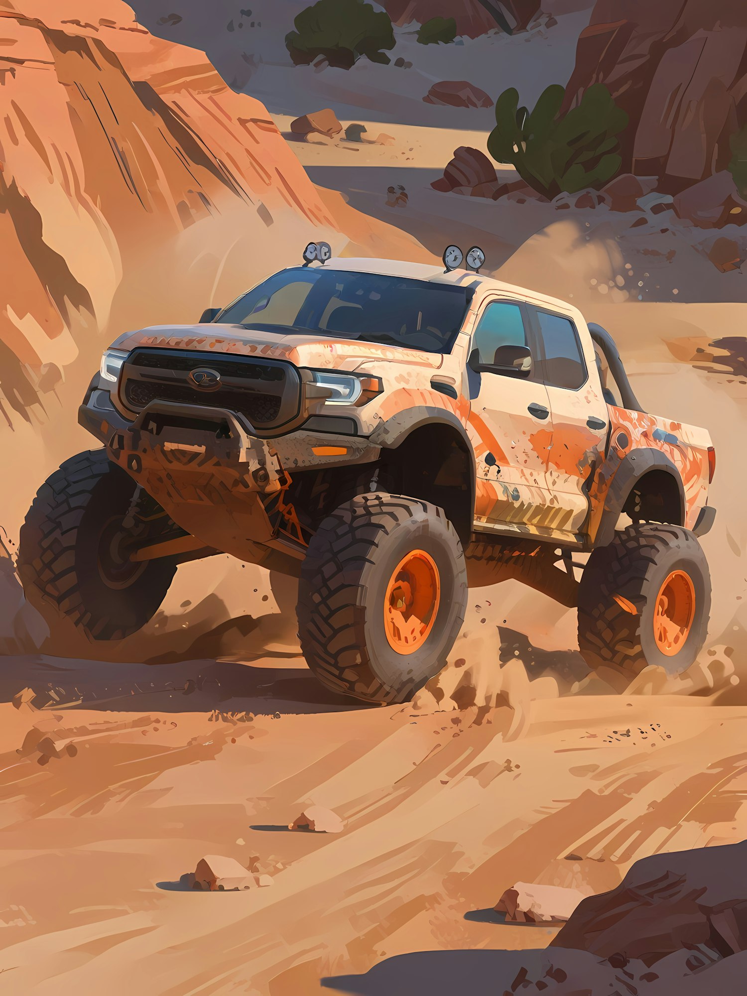 Rugged off-road truck with orange rims and desert backdrop, kicking up dust on rocky terrain. Perfect for adventure enthusiasts.