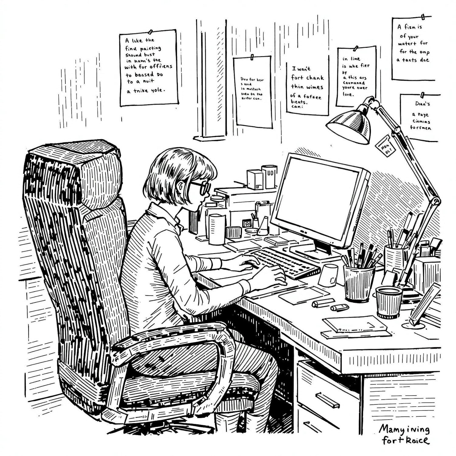 Detailed black-and-white illustration of a person working at a cluttered desk, surrounded by quirky notes and office supplies.