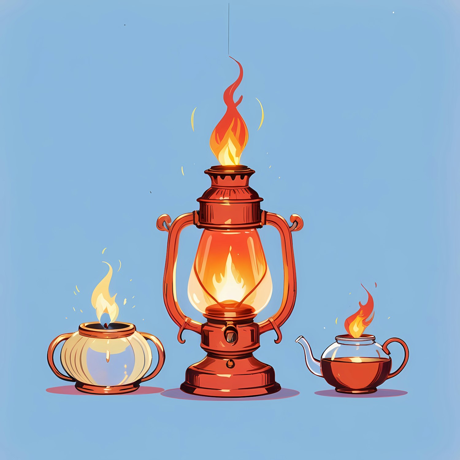 Illustration of three oil lamps: a red hurricane lantern, a golden round lamp, and a teapot-shaped lamp, all with glowing flames.