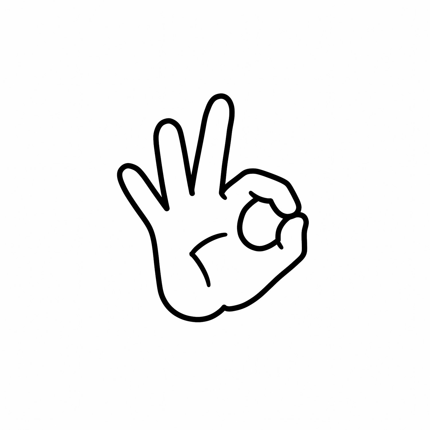 Minimalistic line art of a hand making an 'OK' gesture, with clean black lines on a white background.