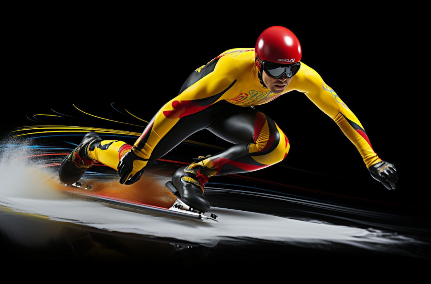 Dynamic speed skater in vibrant yellow and black suit with red accents, captured mid-action on ice with colorful motion trails.